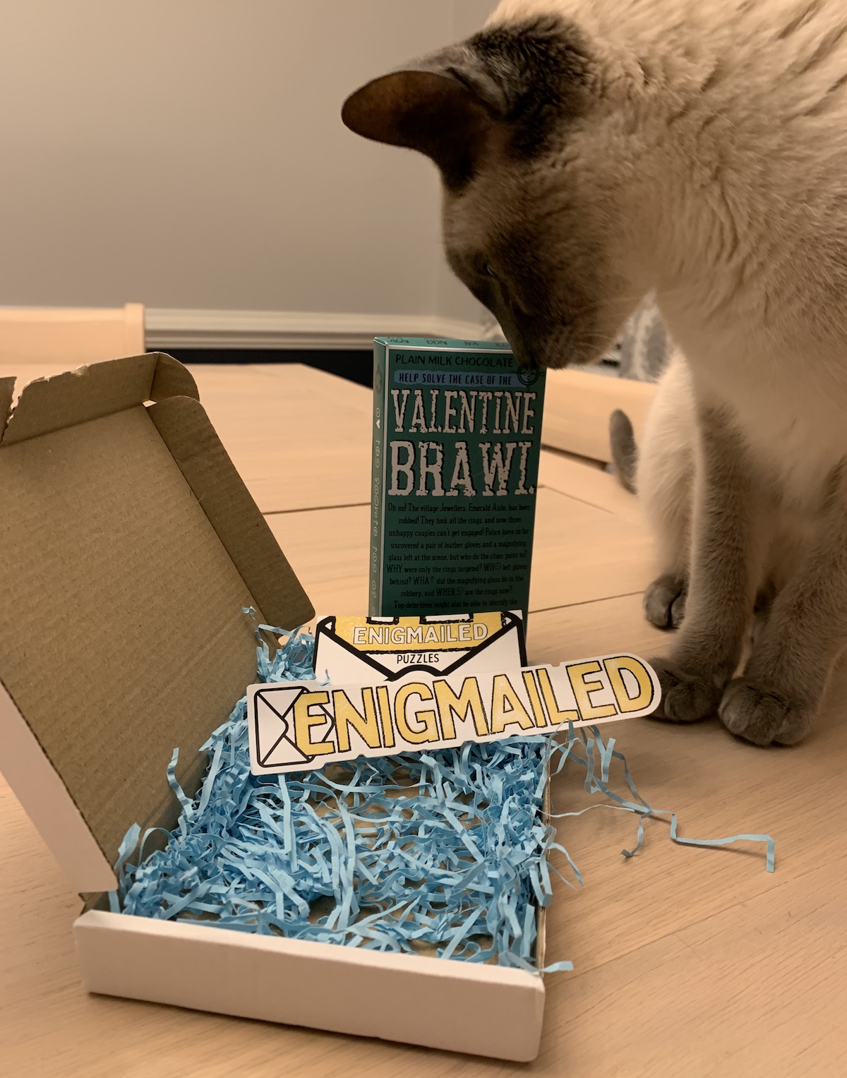 There is only so much room on the wrapper of a chocolate bar, but Enigmailed made good use of the space they had. We liked how they used the shape and dimensions of the wrapper to help separate the elements of the puzzles. Since all the puzzles were limited to such a confined area, we did need to squeeze in close to make sure we both were able to work on the bar together. Again, this was our start to Valentine’s weekend so nothing wrong with a little closeness. If you’re not as comfortable being so tight with your co-solvers, might we suggest an extra bar or two? That would mean more sweets, which is never a bad thing.