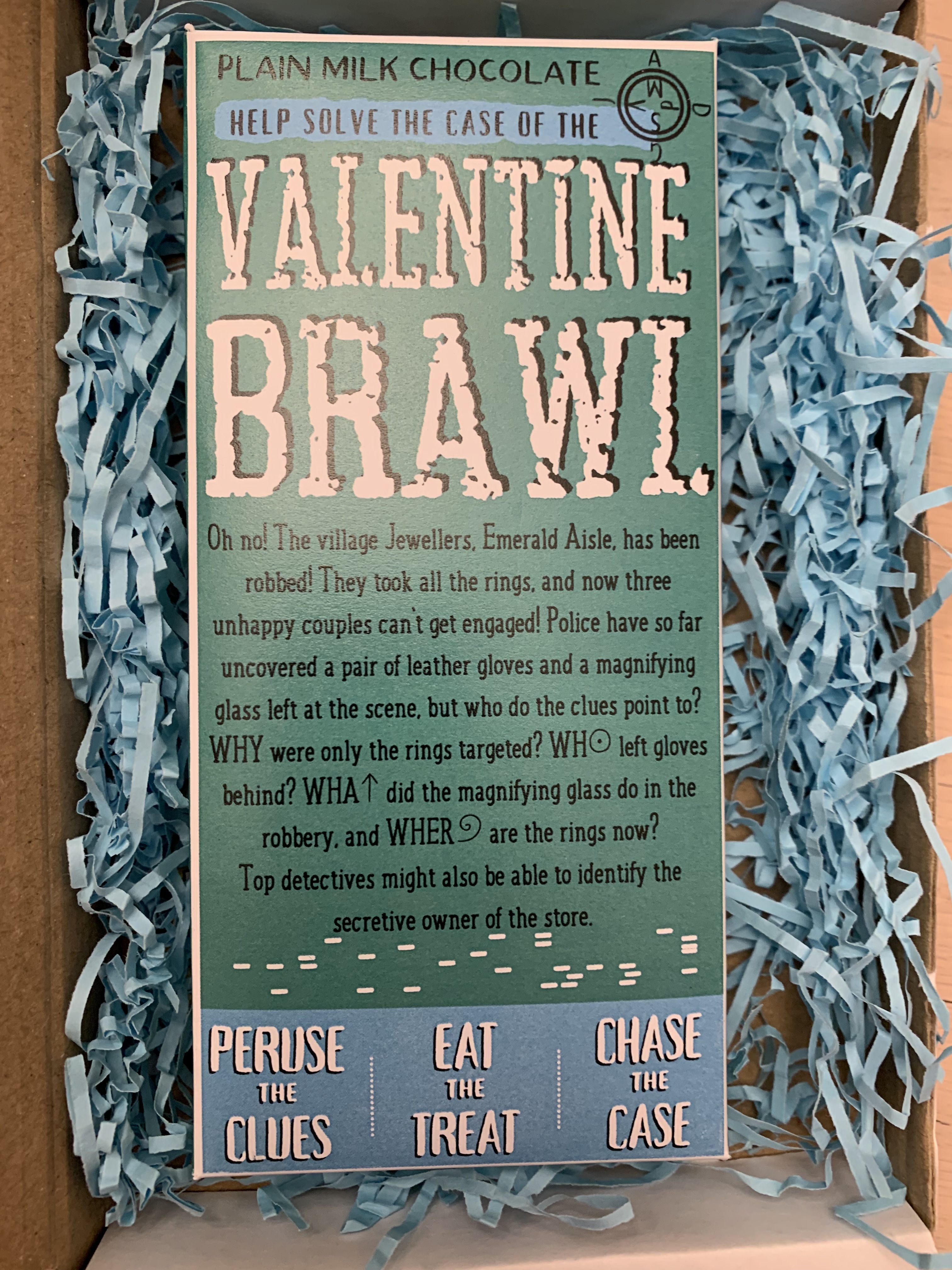 We were given a copy of their milk chocolate Valentine Brawl just in time for the holiday itself. In fact, we got to use it as an opening salvo to our Valentine weekend celebrations. What’s Valentine’s Day weekend without a little chocolate, right? Our case had us investigating a jewel heist and some missing rings.