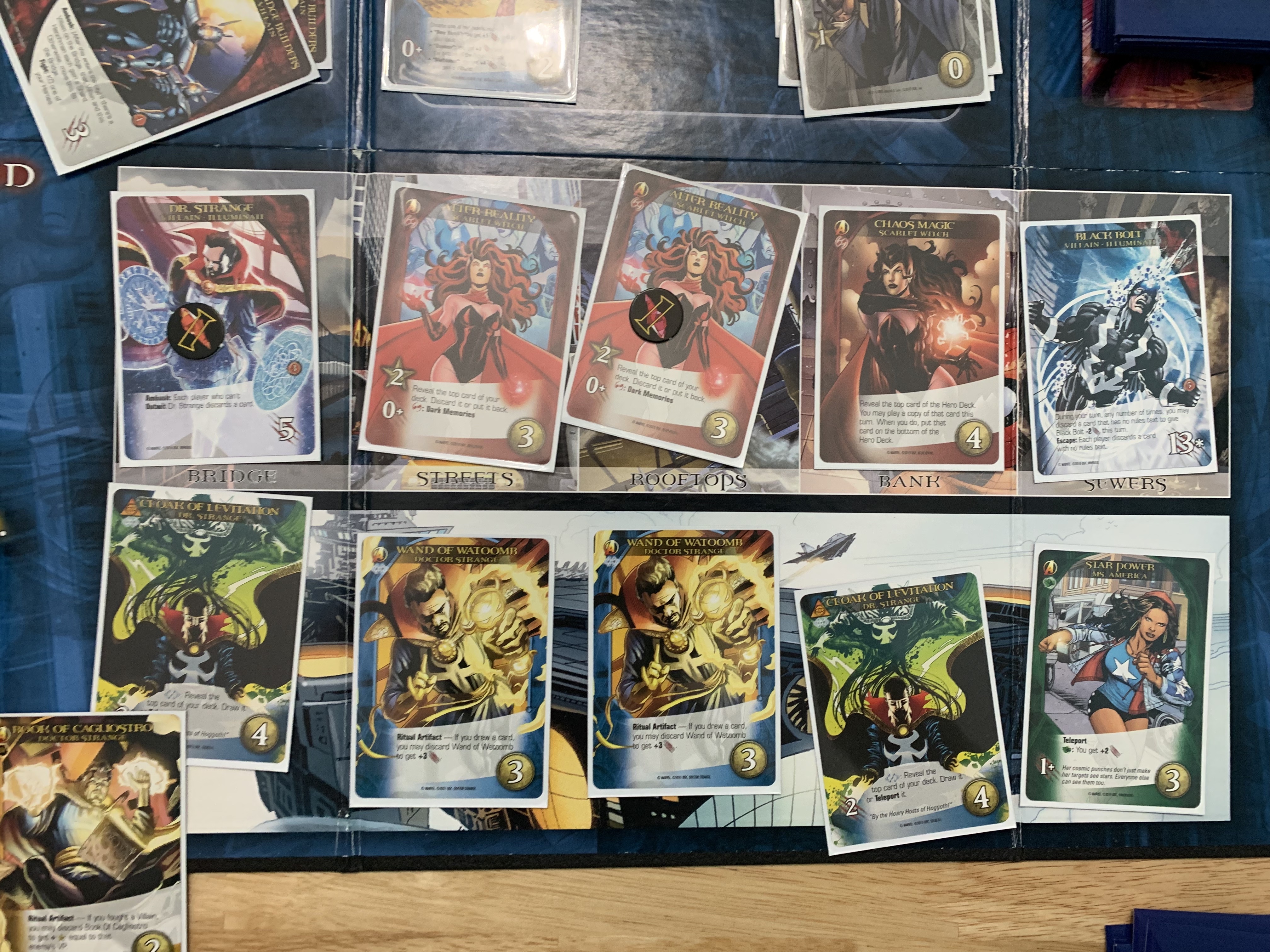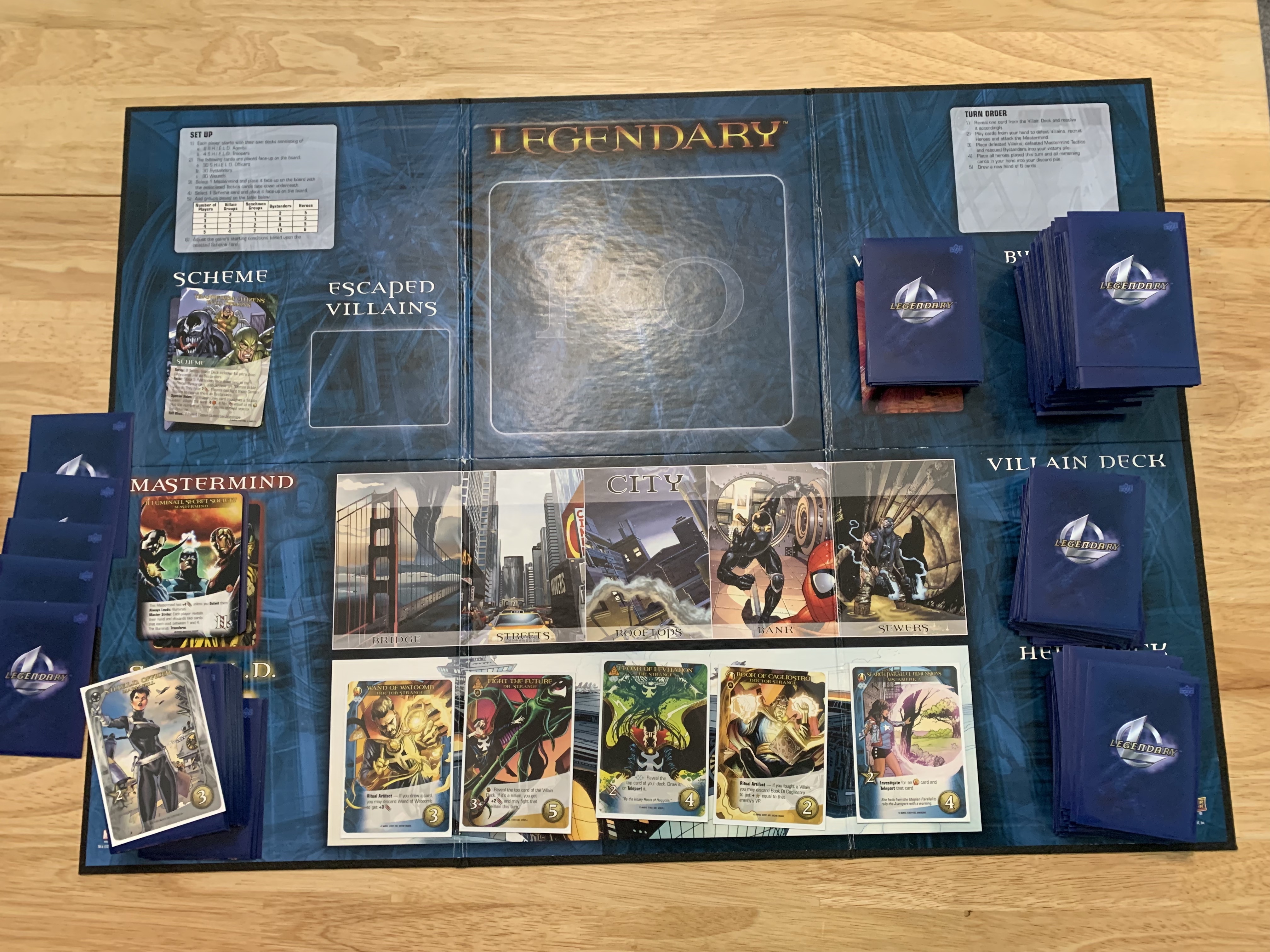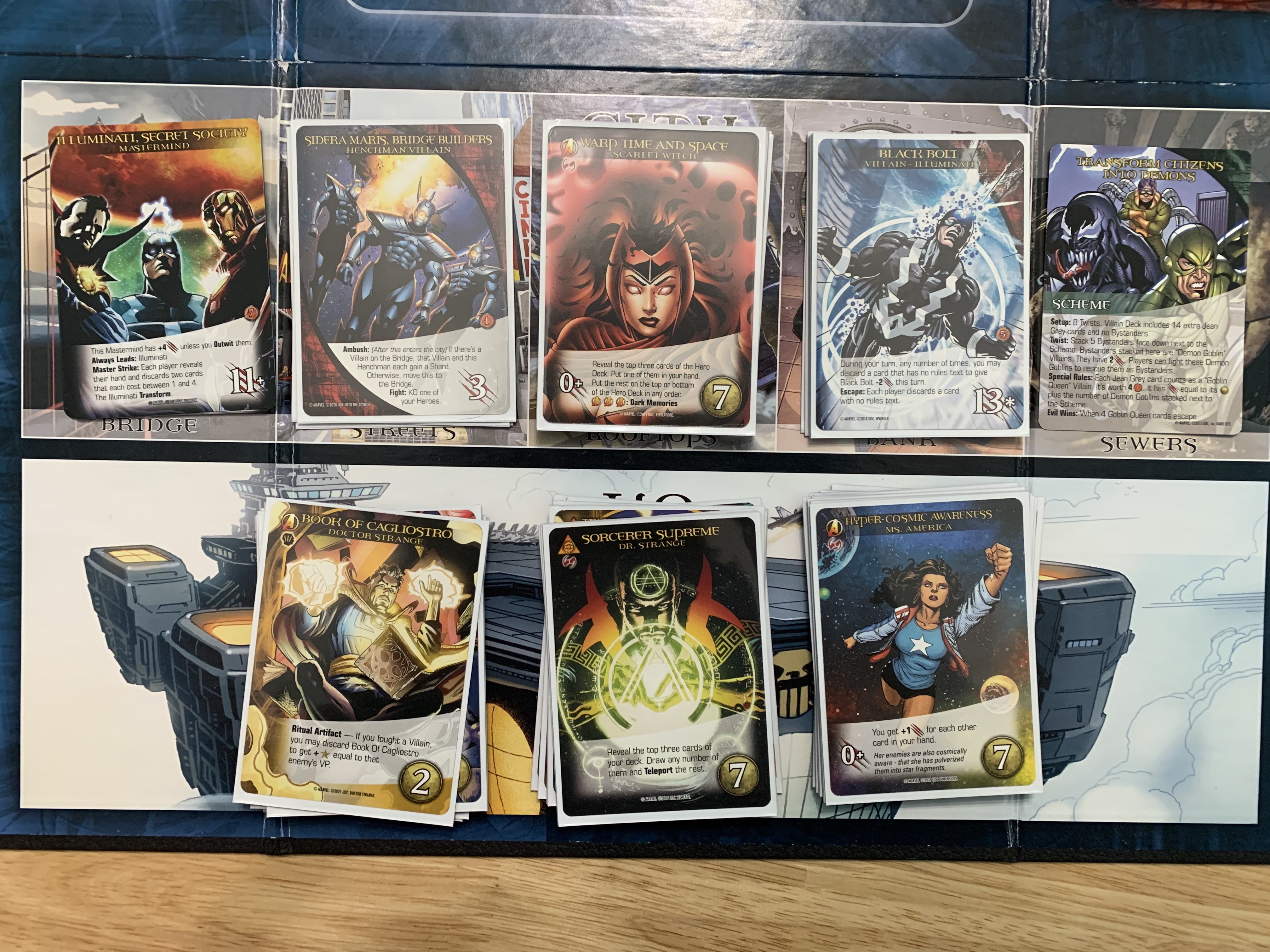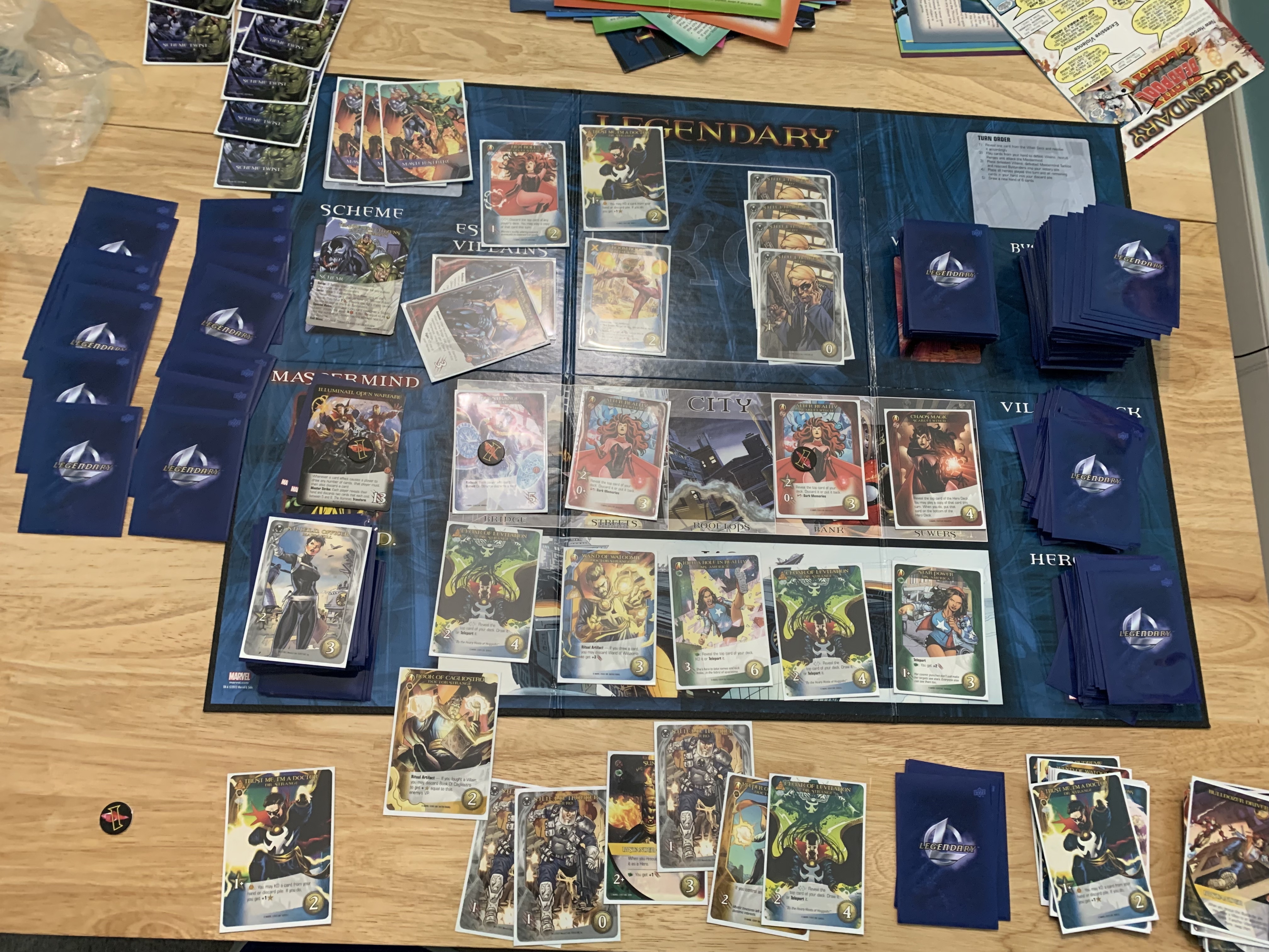 In honor of the recently debuted, Doctor Strange in the Multiverse of Madness, I have created a scenario and setup for Legendary: Marvel a Deck Building Game that tries to capture certain elements of the movie while also maintaining a similar feel. From this point forward, there will be some spoilers for Doctor Strange in the Multiverse of Madness. I will be taking on this untested challenge, which will pit me against both the Illuminati and a power-boosted Scarlet Witch.