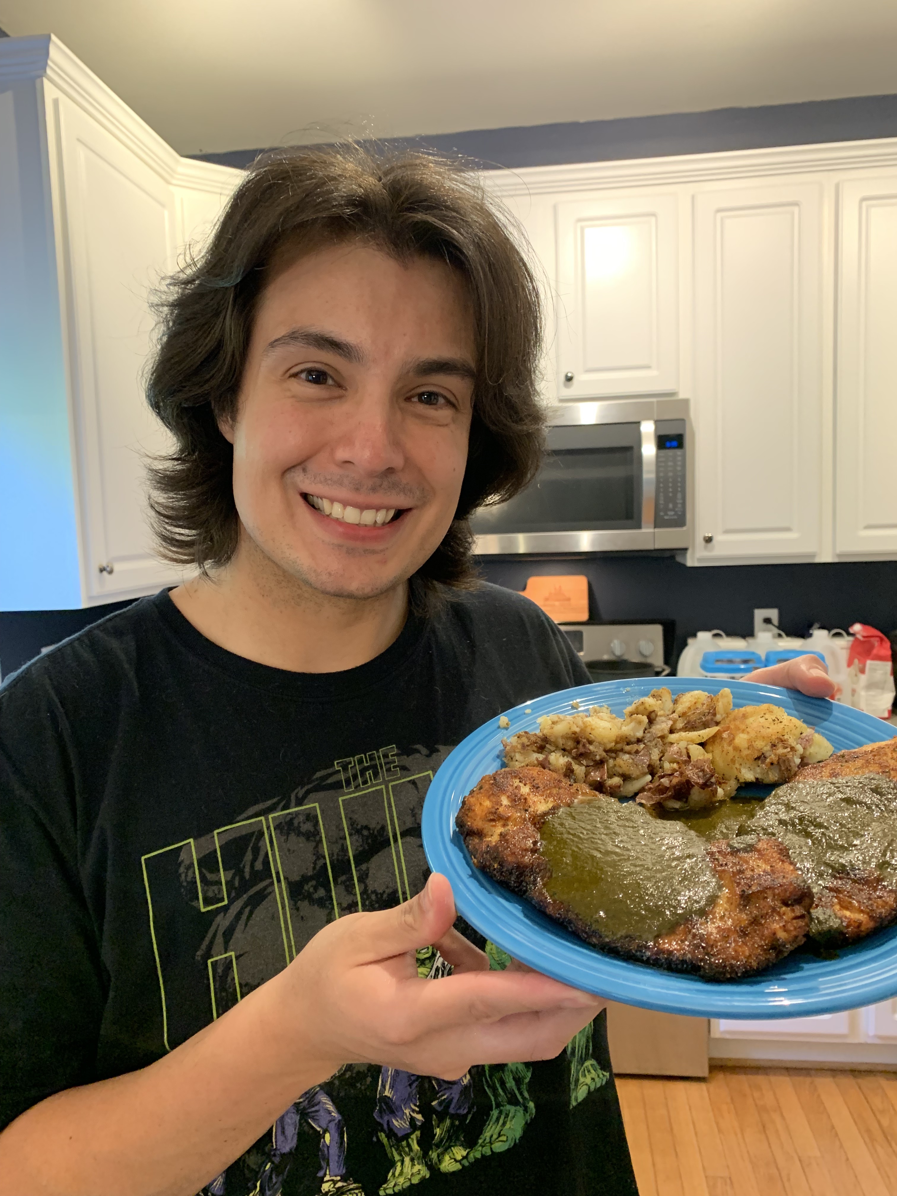 More and more I like to try what my parents are eating. Sometimes, it’s great (salmon) and other times, not so much (asparagus). This Hulk inspired meal really hit the spot. I loved smashing potatoes and the chicken was good too. Dad was afraid I might not be able to handle the sauce, but I demanded more on my chicken when I could get it. Hulk isn’t the best communicator and he sometimes hits things while out of control. I find him relatable.