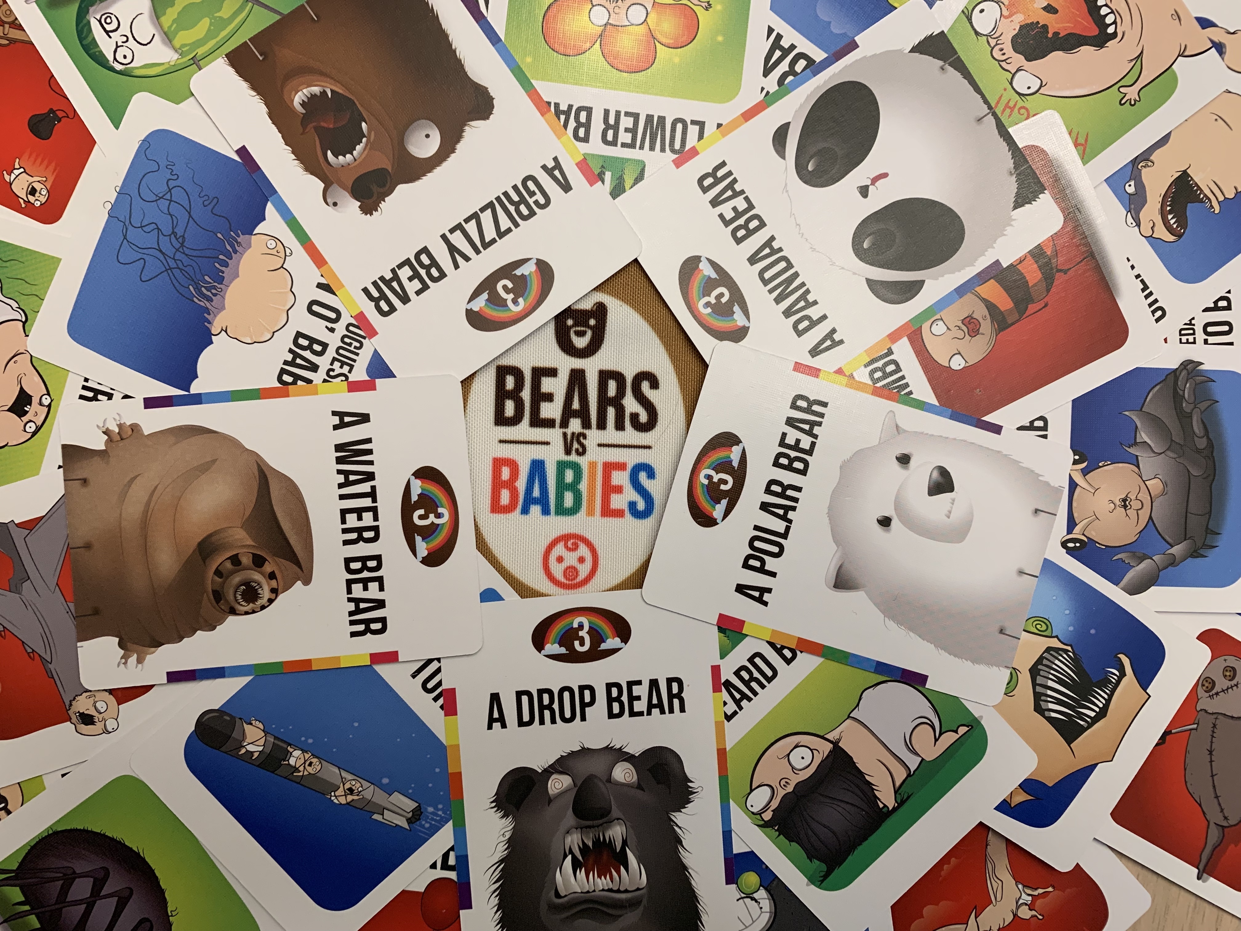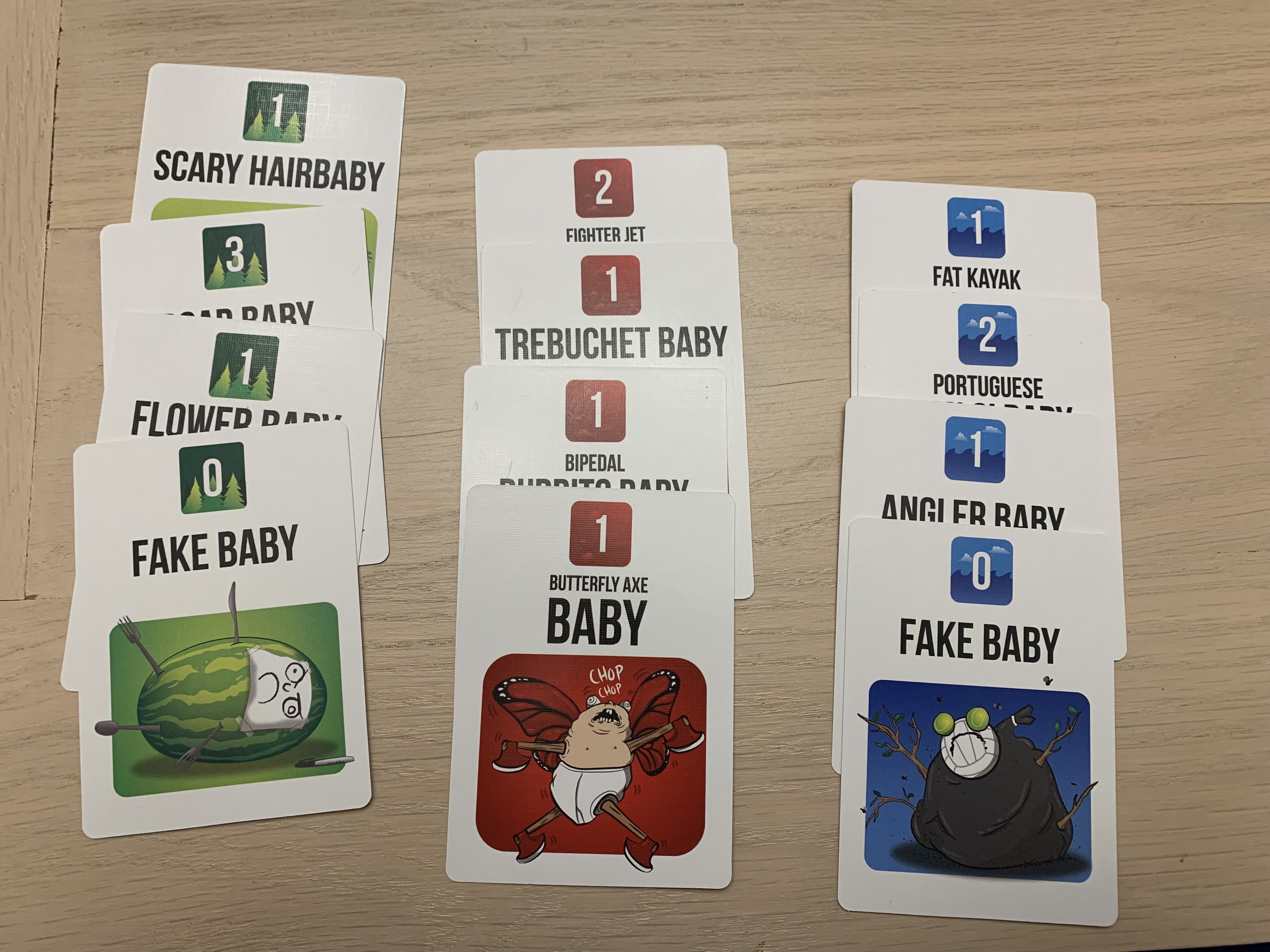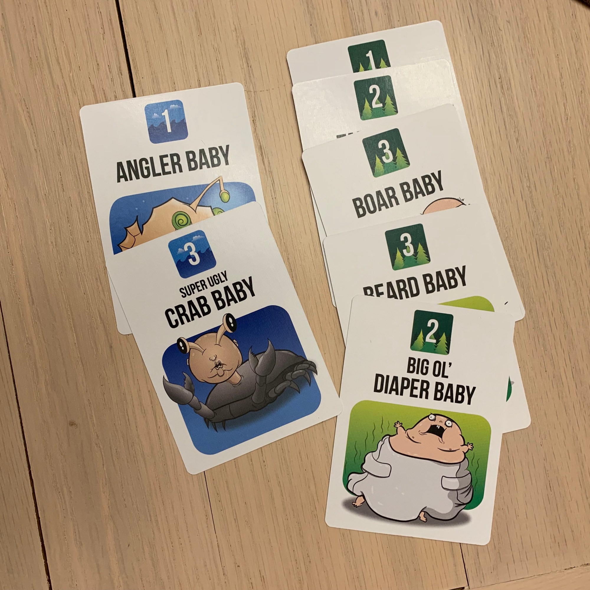 The babies come in three varieties: land, sea, and sky. Monster heads come in those same varieties. When the babies attack, all monsters who match that type, including bears who are all types, must join in the fray. If the babies are most powerful, nobody wins their points. If a player has the strongest power they claim the win and the points printed on the defeated babies. No matter who won or what different power levels were present, all monsters in the fight will be discarded. This means players will have to carefully decide when to pick a fight with babies and when to provoke them just to wipe out an opponent’s army.