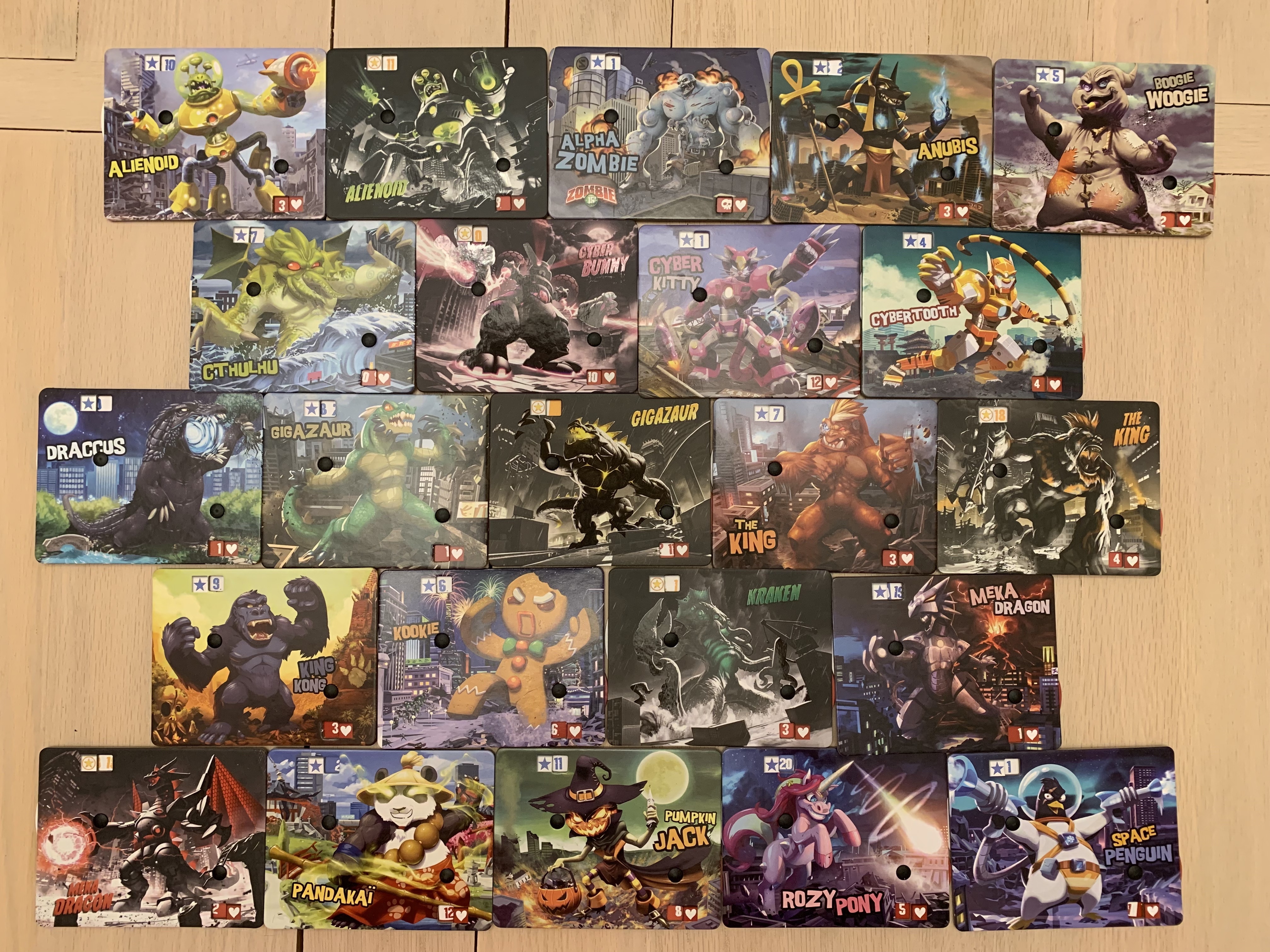 There are many other fun expansions and add-ons for King of Tokyo (many of which we own), but the only other special rule we’ll be using this time around is the Power-up cards. If a player rolls and keeps at least three hearts, they will get one special power-up card from a personal deck of powers. These powers differ for each player, and they can range in usefulness and ability.