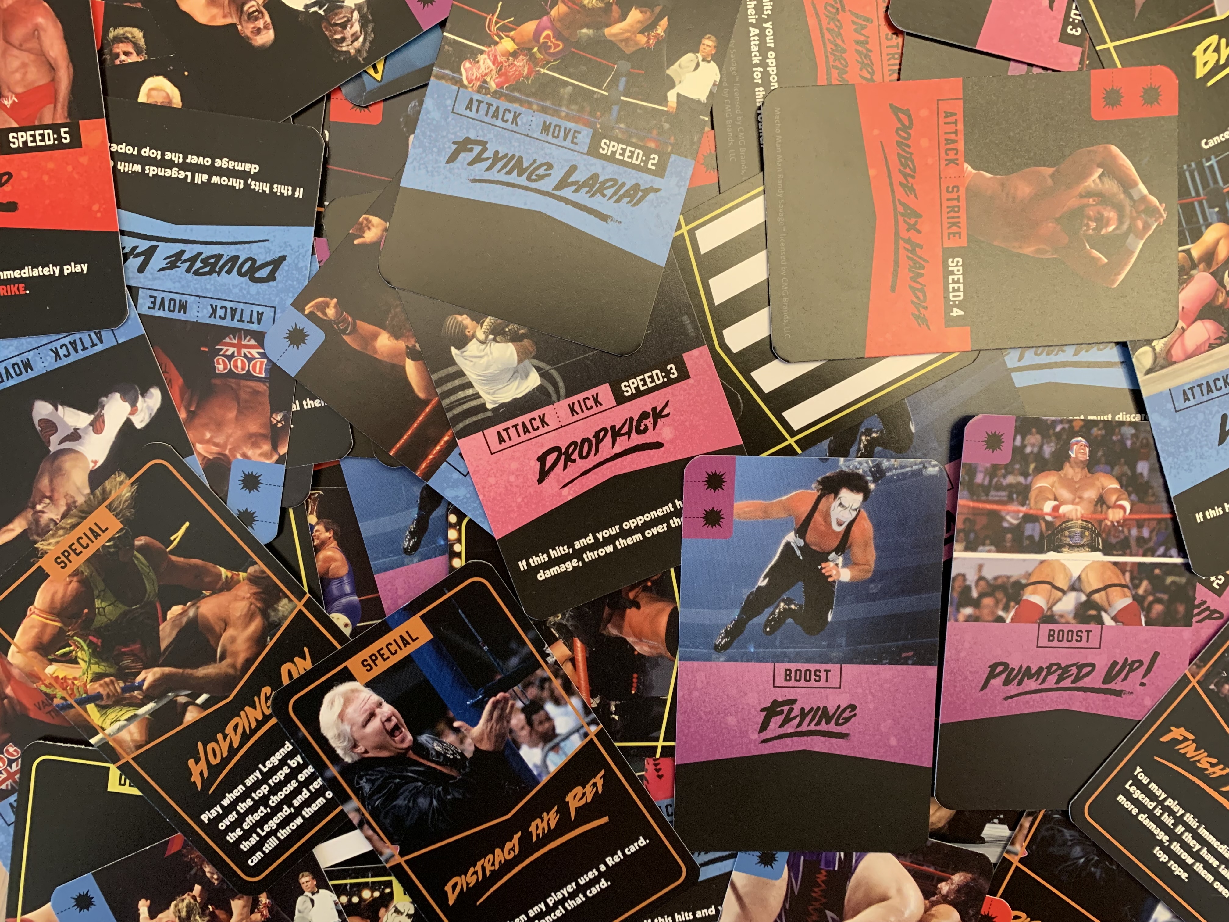 Once turn order is decided, players will execute their attacks. They may have played strike, kick, or move attacks. Some cards are straightforward attacks, while others will have special abilities to enact along with them. Attacks can be modified with boost cards to make them faster or stronger. The opponent receiving the move does have a chance to play a special card to stop the move if possible. If the move cannot be stopped, they take the appropriate amount of damage and play continues unless the wrestler has taken their max amount of damage.