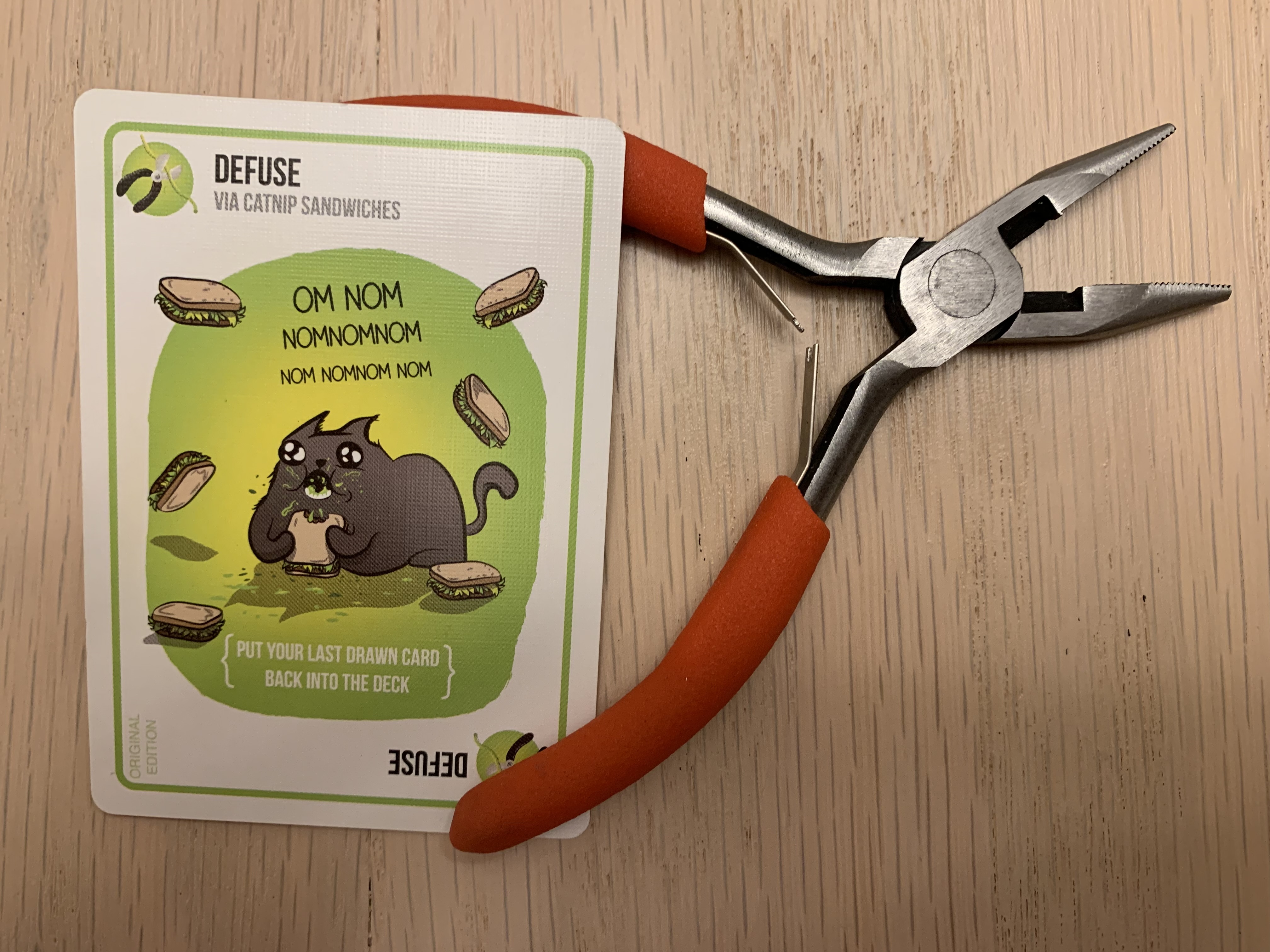 In the final game, the exploding kitten waited until about midgame to pounce. He took Confetti’s defuse, leaving her defenseless. The big difference in this game was that Confetti was able to get her defuse back once, but she was unable to grab it again to start her third exposure to a killer cat.