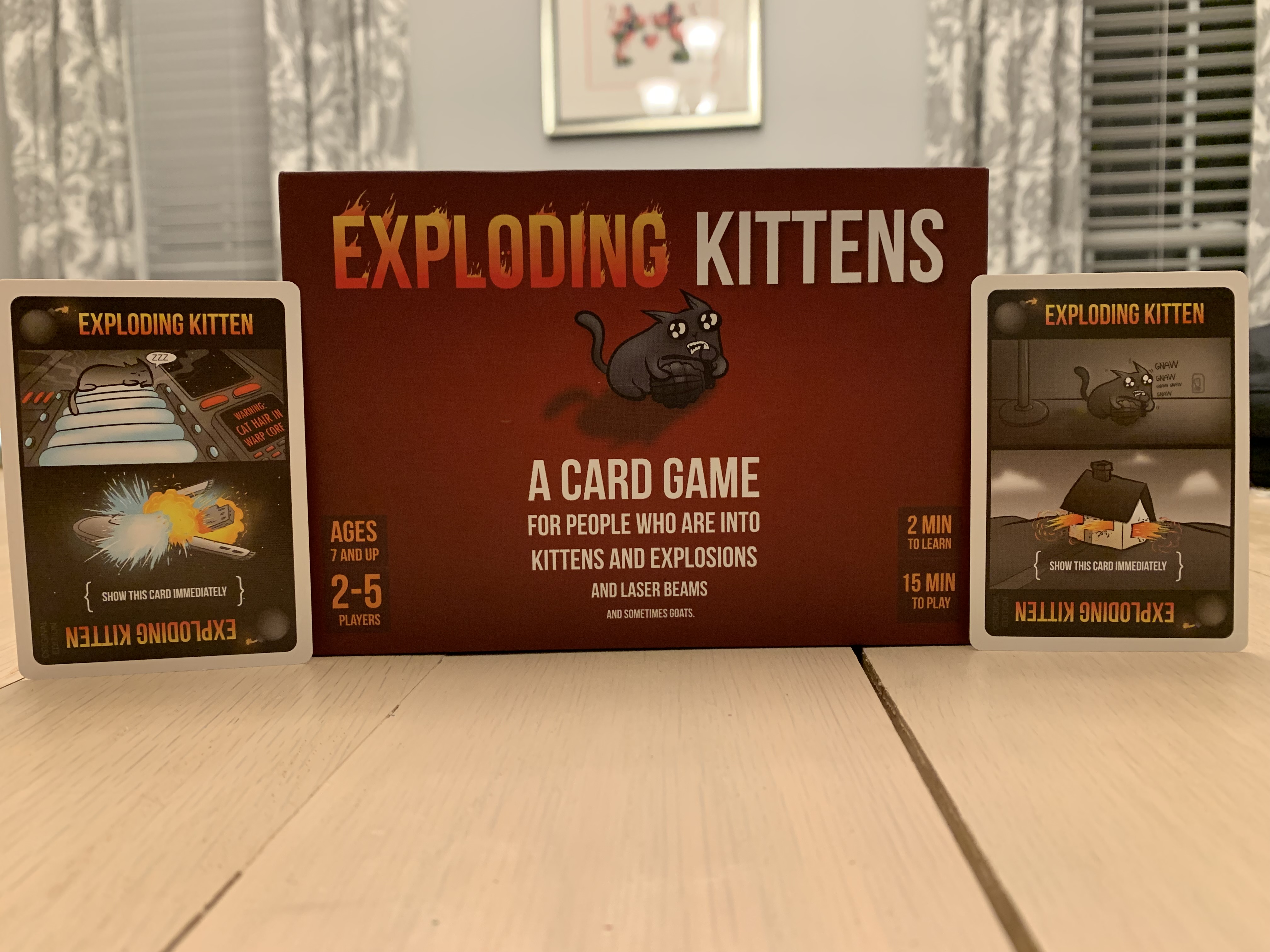 Exploding Kittens is a game where everyone blows up until there is only one person left. That person is the winner!