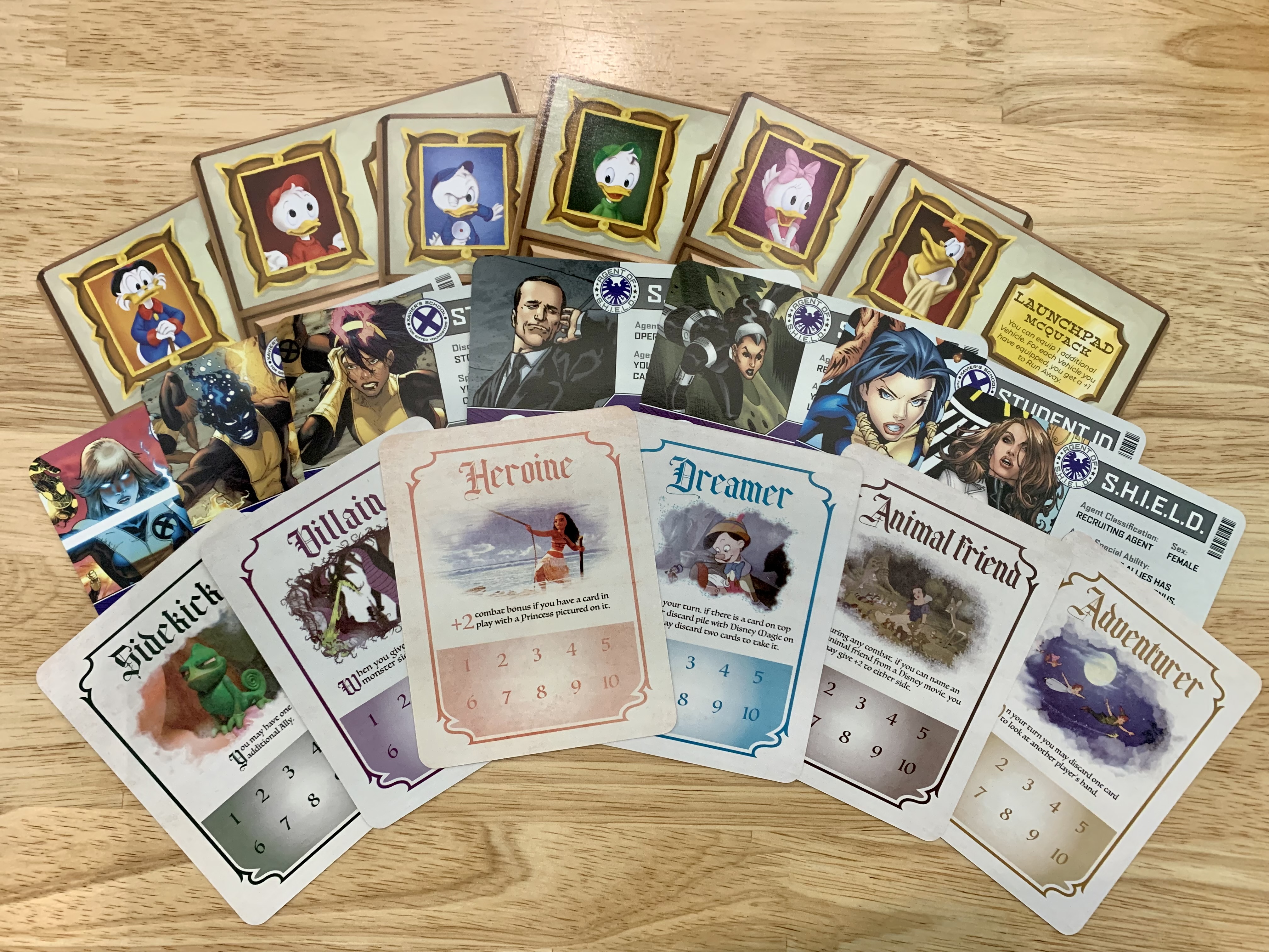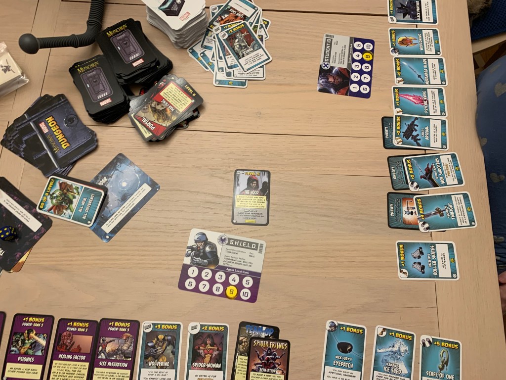 The first game is actually being contested using Munchkin Marvel, featuring the characters from Marvel comics. Our setup is actually a mashup of cards from all the Marvel expansions including X-Men and Deadpool. The main differences in this edition is that there are dungeon cards which have continuous global effects and superpower cars which grant players extra abilities. With that said, let’s hop in. It’ll be a super fight for superiority.