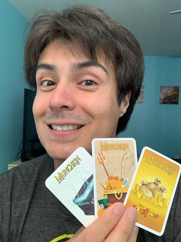 Confetti chose Munchkin Disney for the second round. This version contains a plethora of characters and moments from Disney’s animated features and Pixar catalog. The only big change here is the mechanic called, “Disney Magic.” Some of the cards have extra abilities or enhanced abilities if a player can quote a Disney movie or sing a Disney song that hasn’t been used yet.