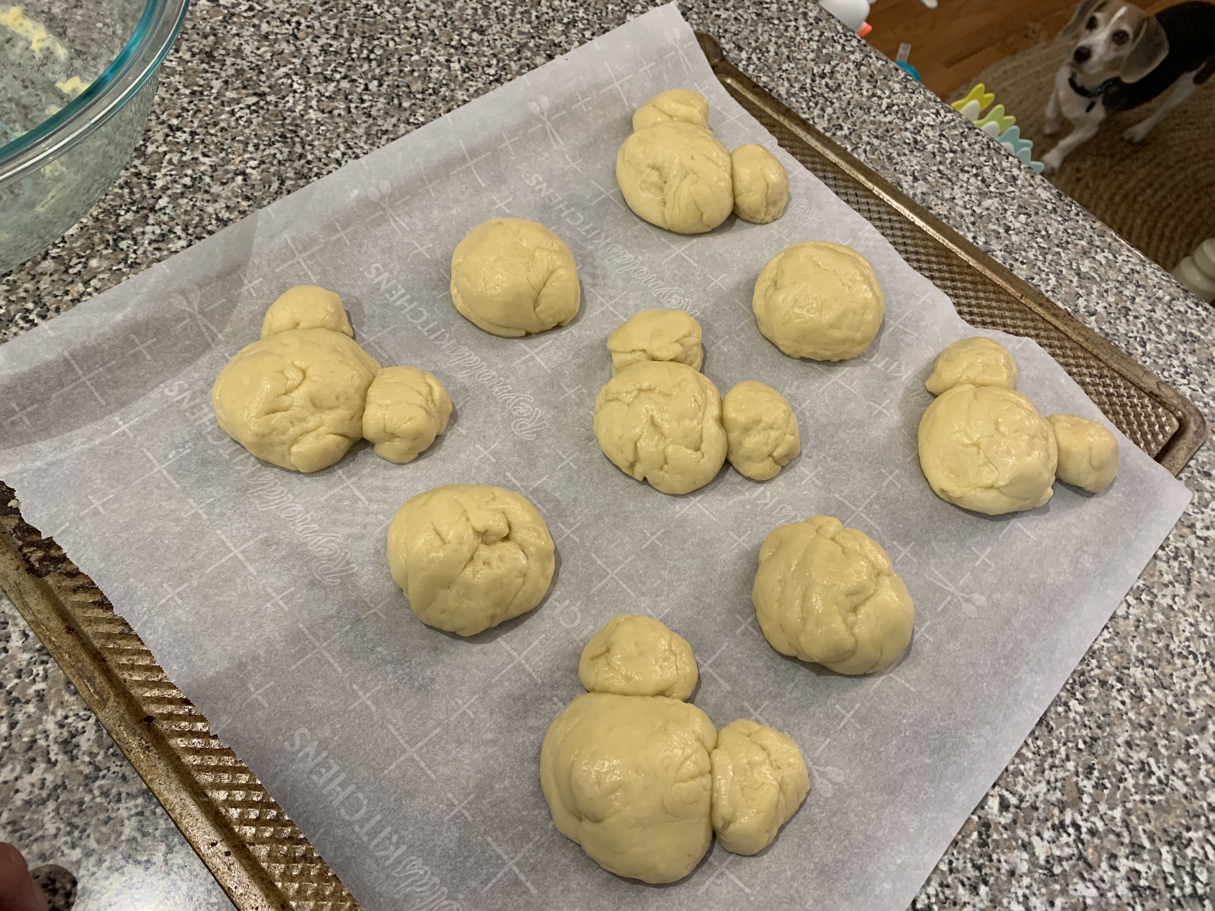 I laid out pans with Parchment paper. Next, I portioned the dough out into smaller balls and split a few of the balls to make several Mickey Head shapes The rest I left round, just for a bit of variety.