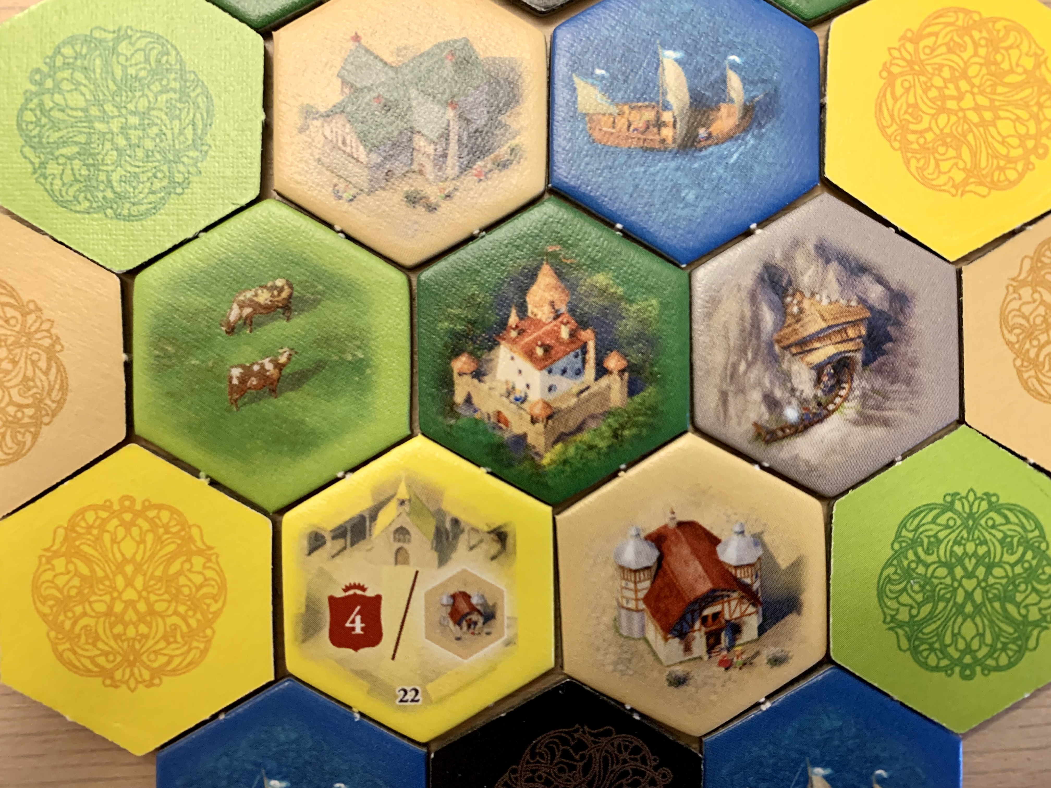 The game has players collecting different types of hex tiles (buildings, castles, livestock, ships, mines, etc) to place in their duchy. Different tiles will have differing effects which should be able to push players towards victory. When considering what to grab and place, players will want to consider specific tile benefits and the fact that completing an area or all of one tile type can earn bonuses. The sooner these bonuses are reached, the larger the points awarded will be.