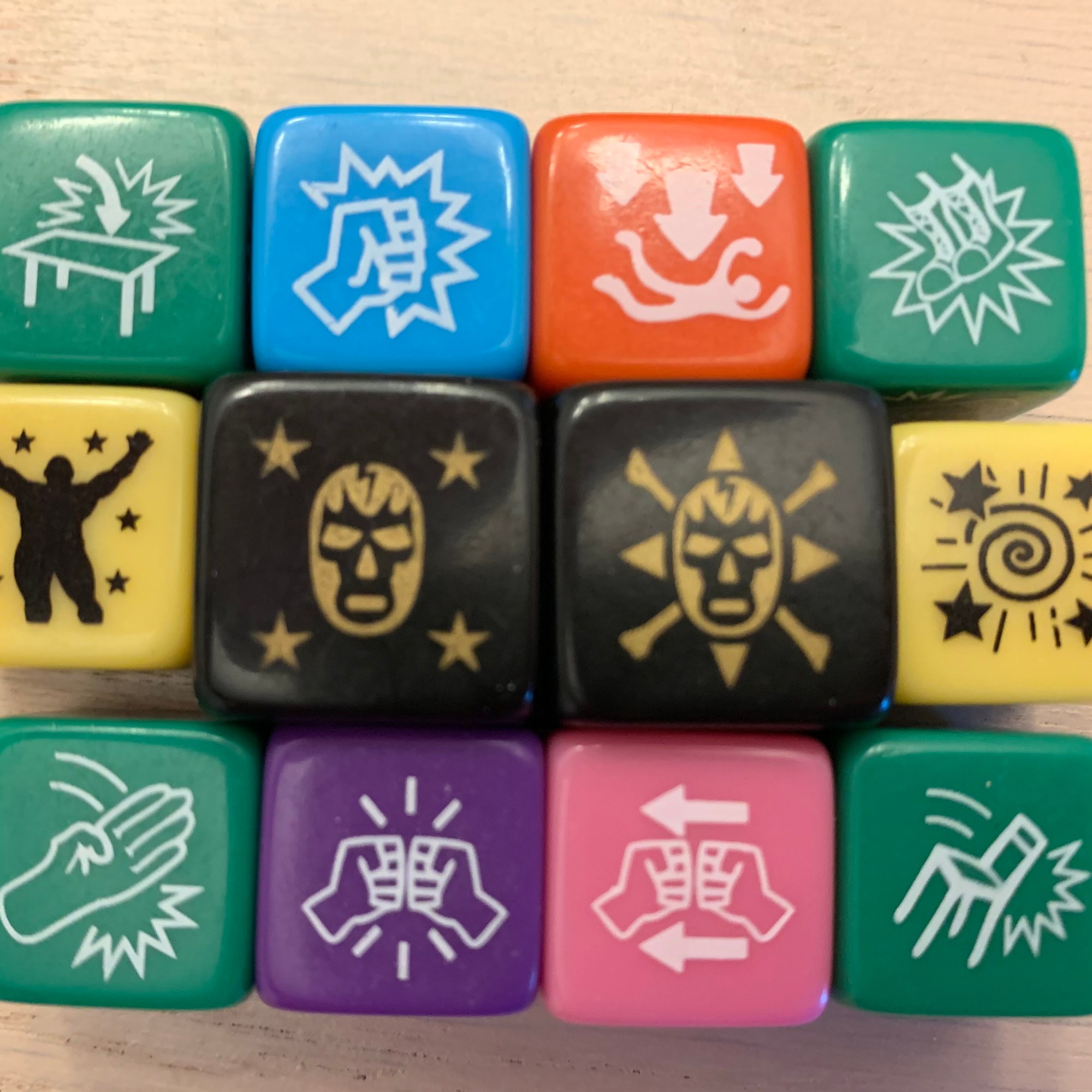 Before rolling their hit dice though, if a player has earned two or more hit dice rolls, they made trade two rolls for a roll of the luchador die. This will give the player a chance at hitting a signature move. Signature moves hit for damage, but they also come with their own risks. The luchador die has a miss option which does no damage and an injury side which stuns the attacking player (they only roll three dice next round). The luchador die represents the high risk, high reward style of high flying action.