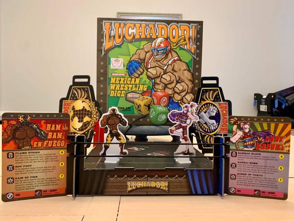 Despite what may seem like a long list of rules, Luchador! Mexican Wrestling Dice is actually a pretty fast paced game. It did not take long for the competitors to start beating each other with chairs, forearm smashes, chops, and more.