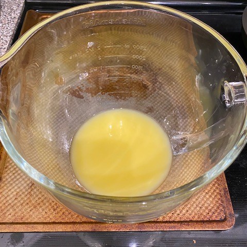 I have a glass mixing bowl, so I melted my butter in that. While that cooled, I went ahead and melted the chocolate chips in a small pan on my stove. I took that off the heat and set it to cool.