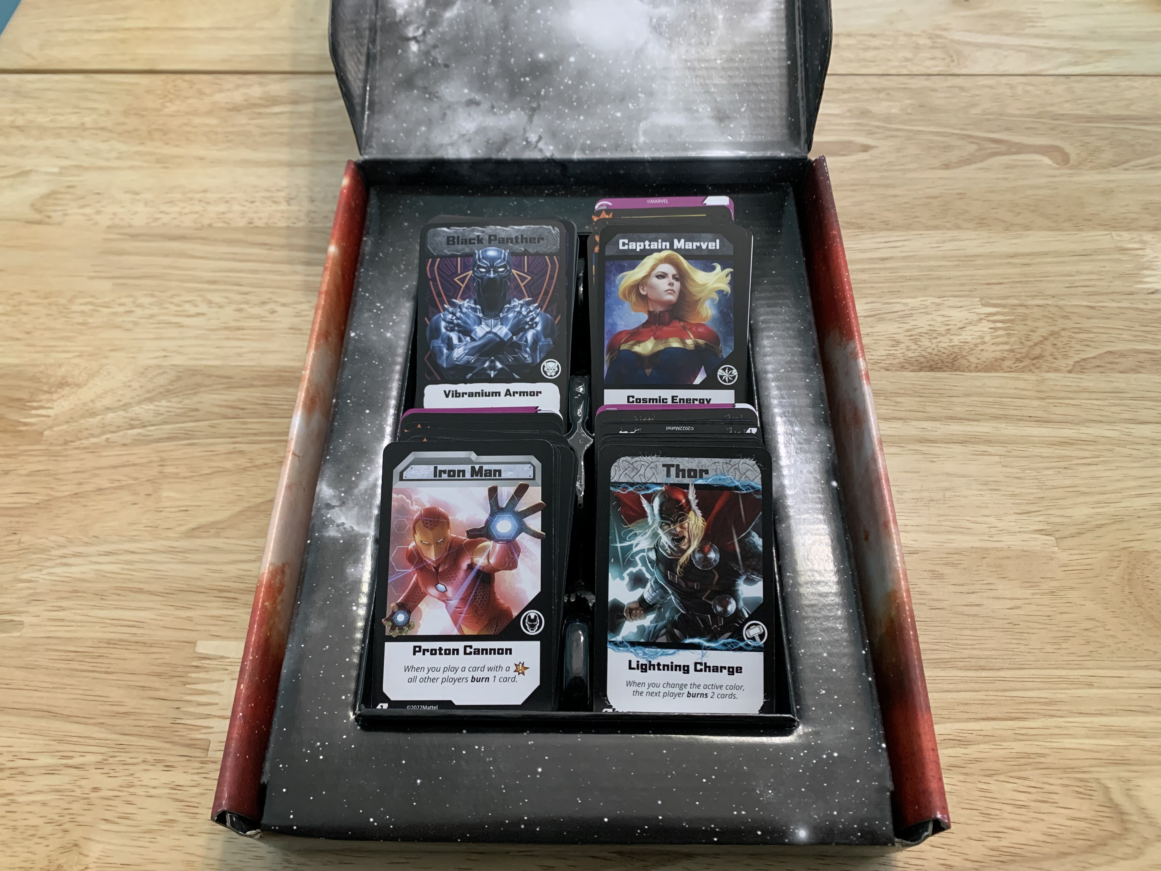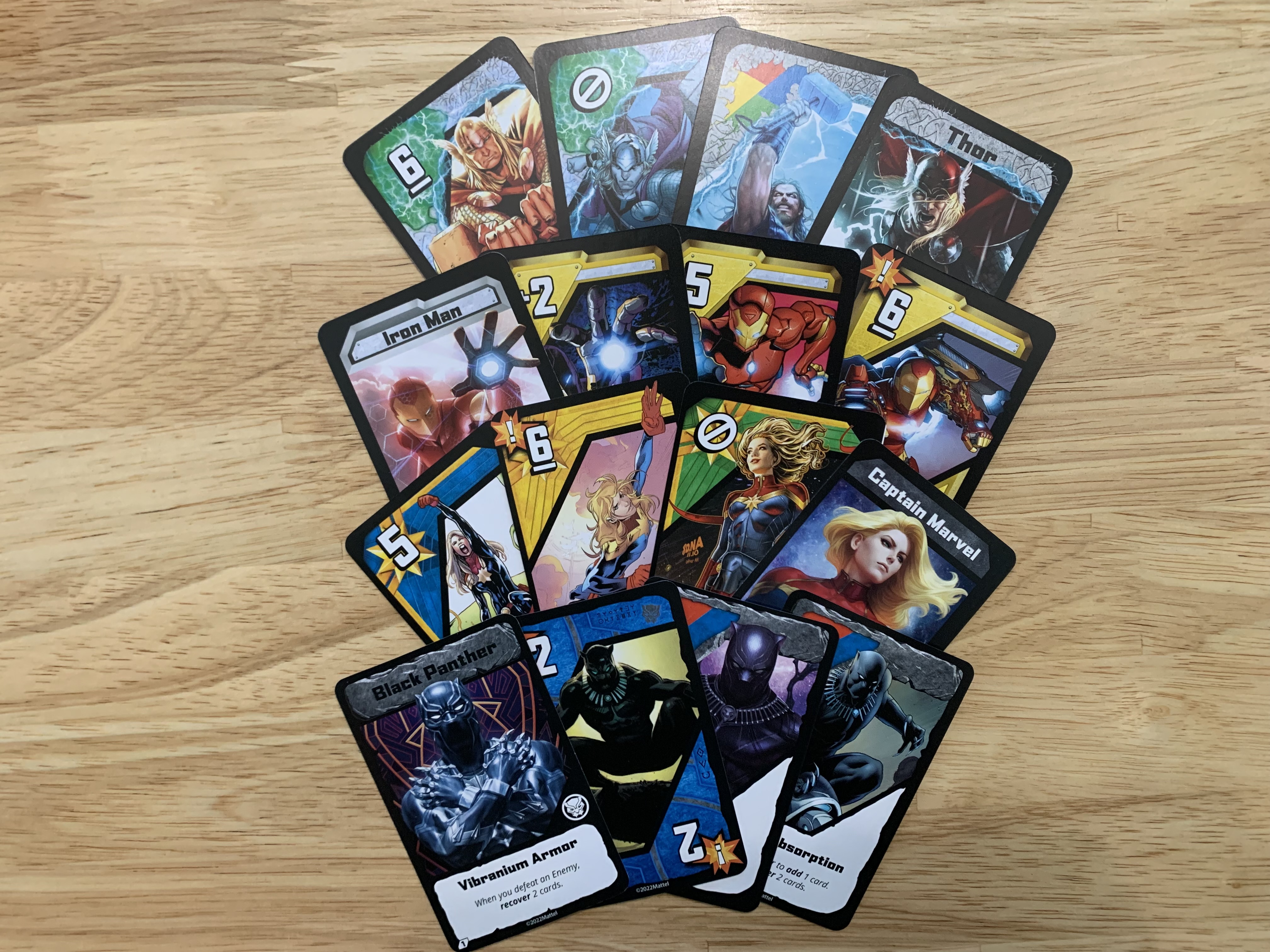Each player will start with a hand of seven cards, a character card, and an individual character deck. Players will be able to choose a Marvel superhero as their character. The base game comes with Black Panther, Captain Marvel, Iron Man, and Thor, however, more character add-ons have been released. There will also be a communal danger deck built from the danger cards provided by each character deck.