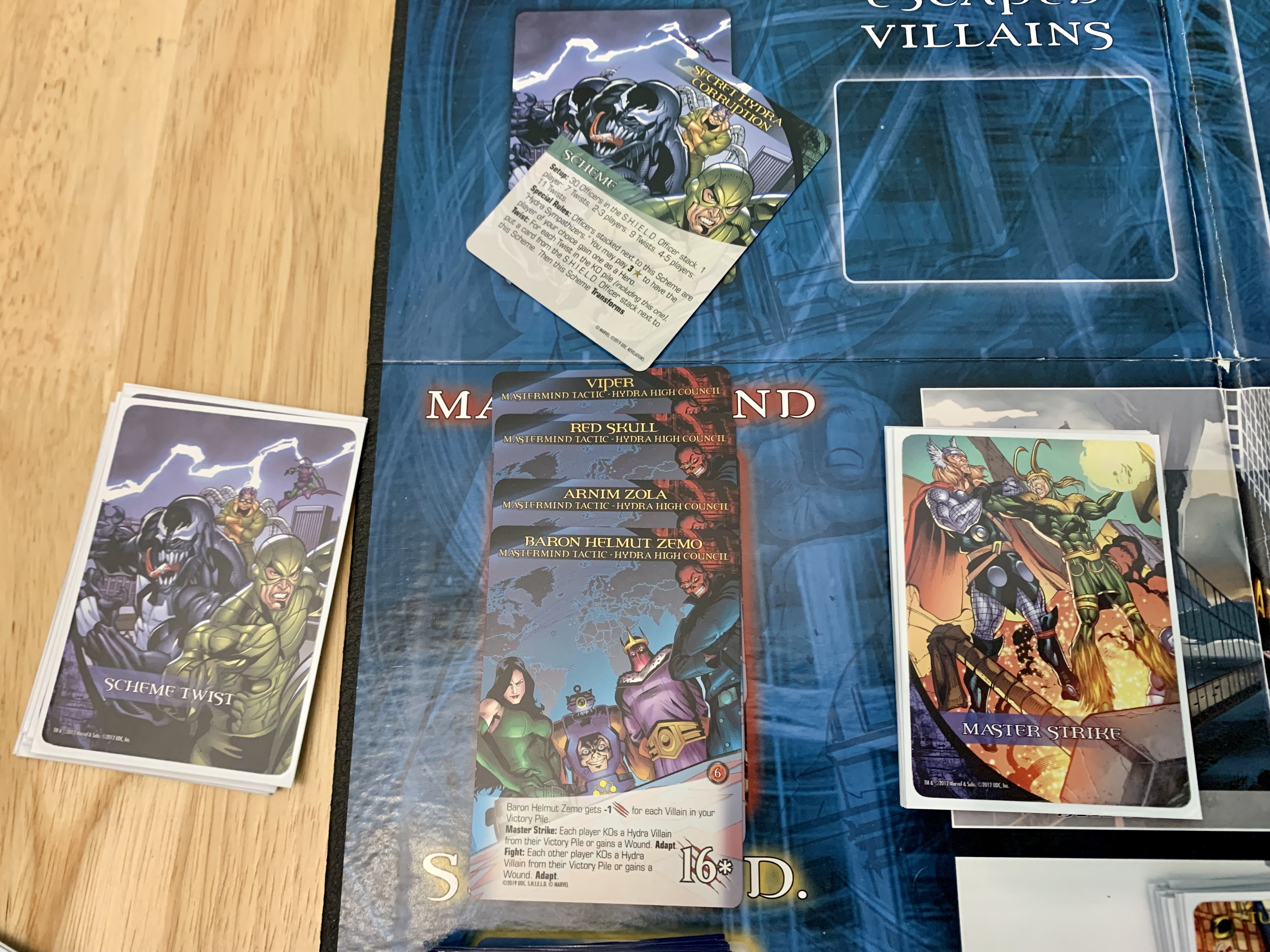 The Hydra High Council felt like an easy representation for the United Nations/World Council. I opted for the “Secret Hydra Corruption/Open Hydra Revolution” because it fit the movie’s idea of the other nations wanting to secretly undermine Wakanda (CIA meetings and French blackops) while also threatening to become much more direct with their attacks. The building SHIELD officers could symbolize the growing number of nations opposing the Wakandan/Talocan alliance. Buying them off would represent negotiations and fighting them would represent war. I could lose by either seeing 15 SHIELD officers by the scheme (too many nations opposing me) or running out of cards in the SHIELD officer deck (no more nations holding back against us).