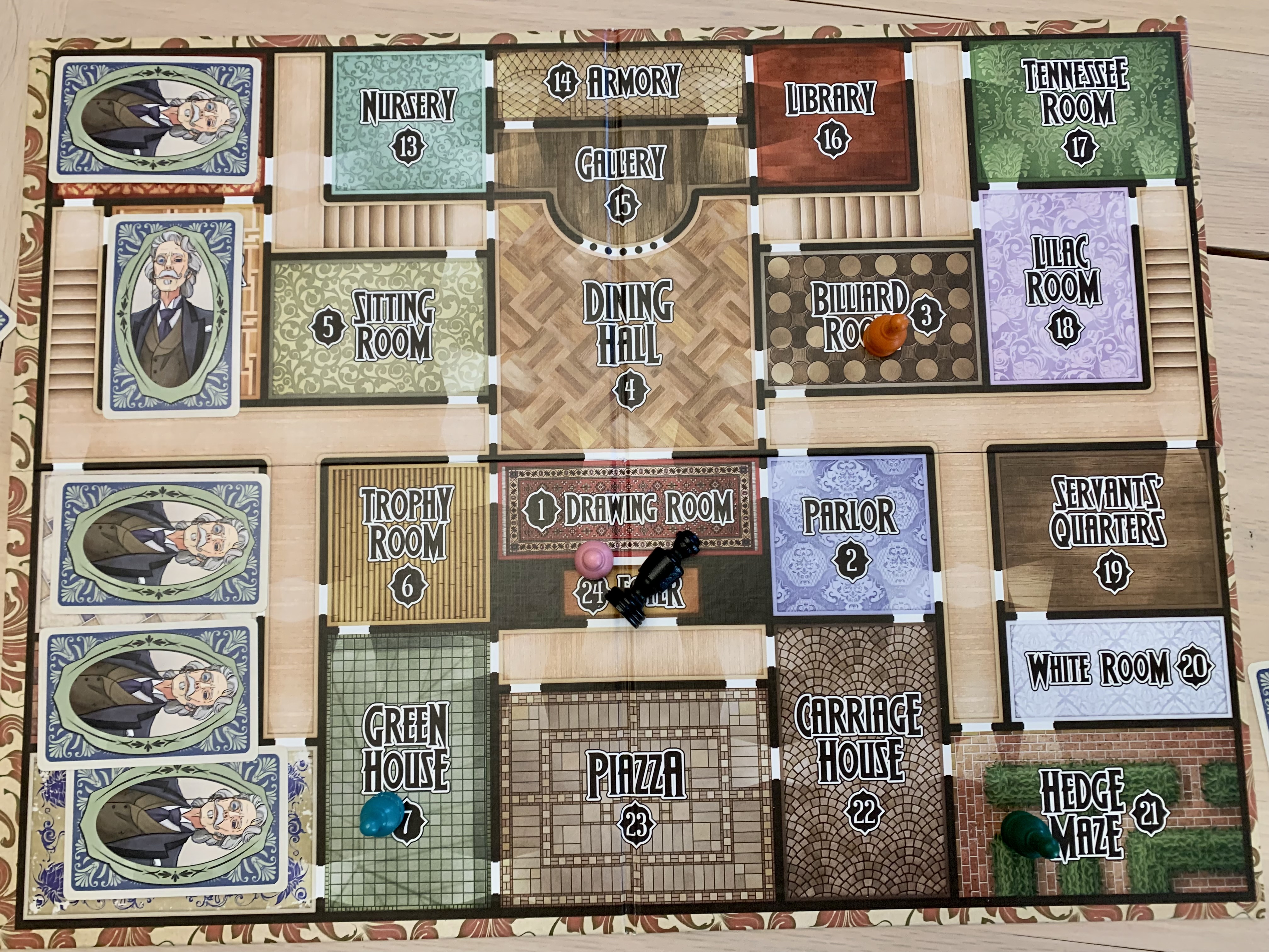 Opting for their favorite colors, Chaos would be playing as Proximo Domingo “The Banker” (Green) and Confetti would be playing as Cathcart Brunsonby “The Fixer.” The non-player guests would be Gail Russo “The Avenger” (Teal) and Augustijn Oraange “The Gambler” (Orange). This game took place on the traditional board with the west wing closed.