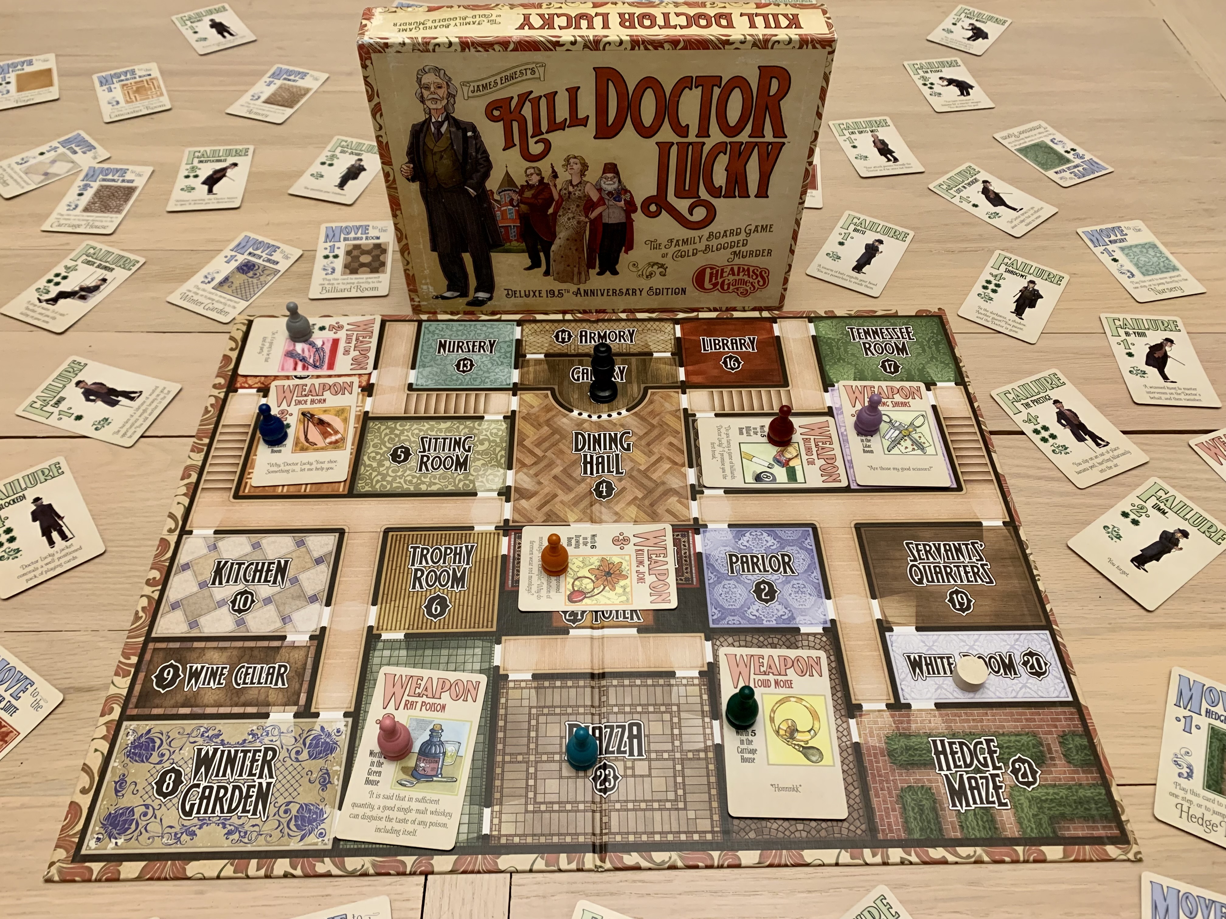 If a guest is completely out of sight of other players and Dr. Lucky, they may draw a card. Cards may allow extra movement or provide weapons for attacking Dr. Lucky. Many cards will also have cloverleafs which can be used to prevent the murder of Dr. Lucky.