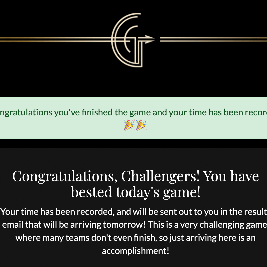 While the challenge was marketed as being appropriate for ages 13+ and requiring 3-4 hours to complete, teams have beyond the original time frame to complete the challenge. However, any team that finishes within the first 24 hours does get their name officially submitted on the ranking list.