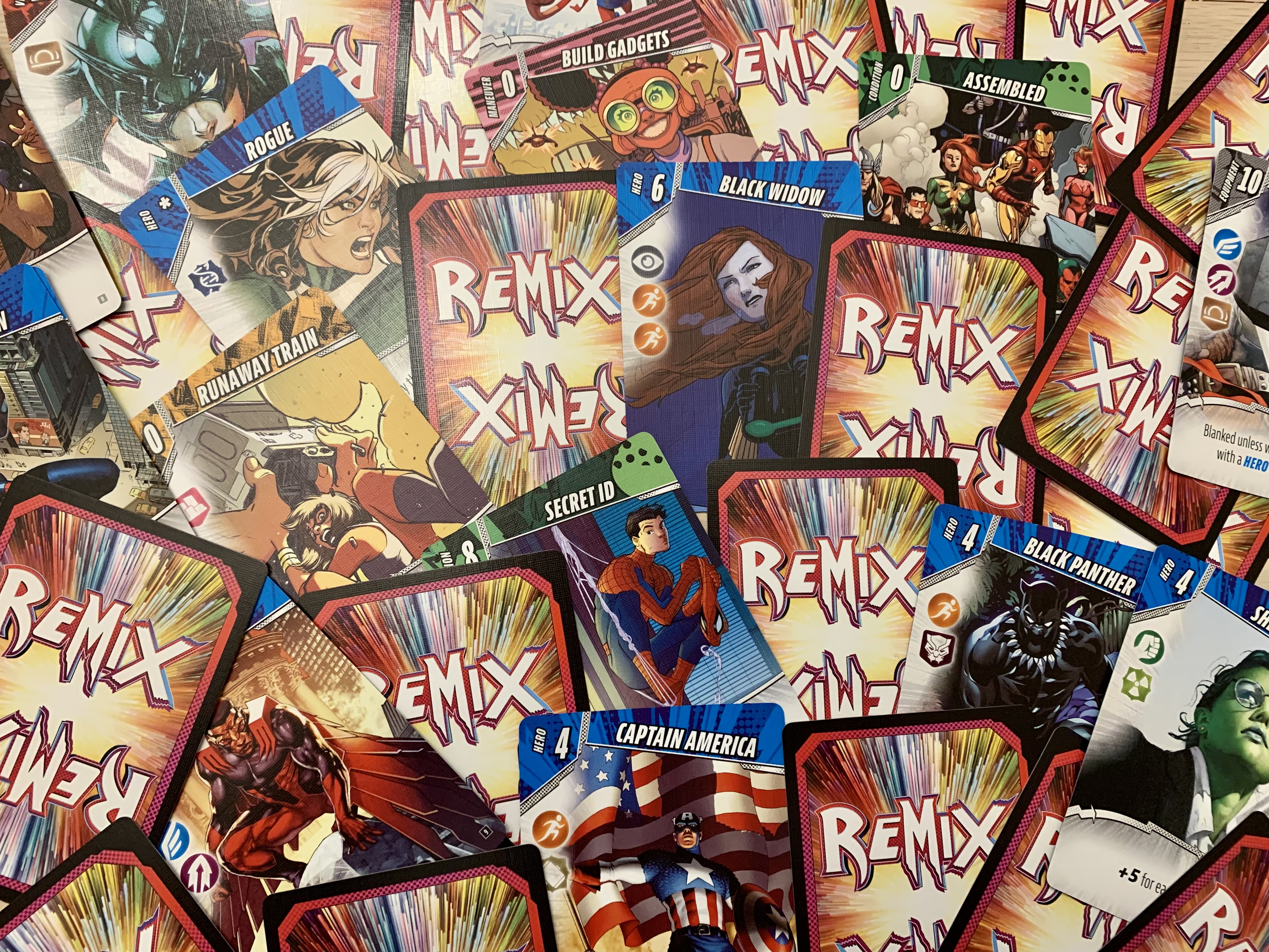 On their turn, a player may draw one card from the remix deck, villain deck, or face up discard pile (if there is one). After they draw, the player will discard one card from their hand into the faceup communal discard pile. This hopefully helps shape a player’s hand into what they want, but may also provide more options and help for other players as well.