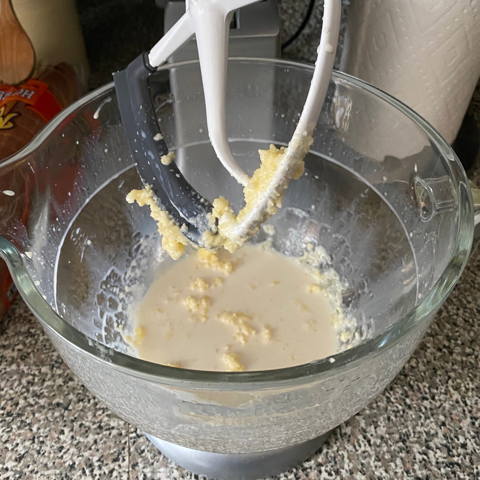 First, I preheated my oven to 350. My mini muffin pan is new and nonstick, so I decided against muffin cups (I didn’t have mini ones) or spraying with non-stick spray. I combined my wet ingredients (milk, lemon juice, melted butter, vanilla) in a bowl and mixed with a whisk. I didn’t like how things were coming together (my butter wanted to clump up), so I pivoted and dumped the wet mixture into my kitchenaid mixer instead. I kept the paddle attachment instead of switching to mix whisk attachment because 1) I am lazy and 2) I thought the paddle attachment would handle the clumps better.