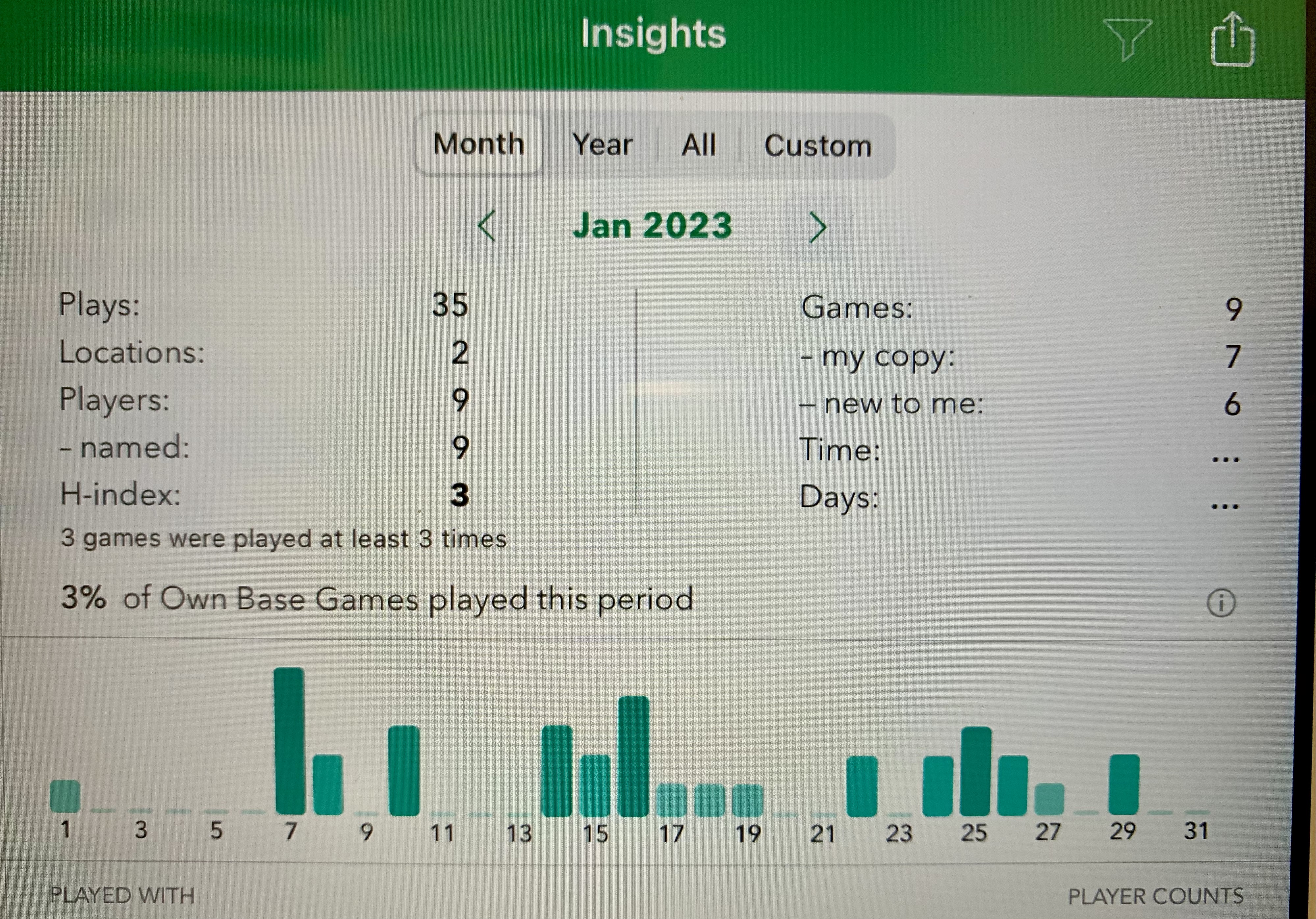 It’s the same with my books and board game stats. I use them to set goals, but to also make sure that I make time for the things I want to do. It’s easy to put pleasurable things on the back burner to responsibilities and simply spacing out, but telling myself I plan to hit certain goals gives me reason to make the time (it’s one of the reasons for this blog).