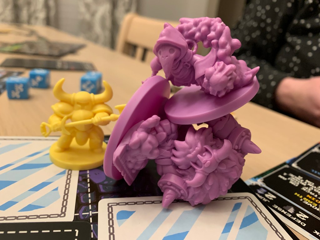 King Knight is the suggested opponent for first time players, so he isn’t a terribly difficult fight. However, like many aspects of this game, it all comes down to the rolls. Chaos’ extra movement granted him more swings at King Knight but he kept rolling all misses. Even his bigger attacks granted by items kept falling short. His defense rolls kept finding the opposite faces and doing little to protect him from attacks.