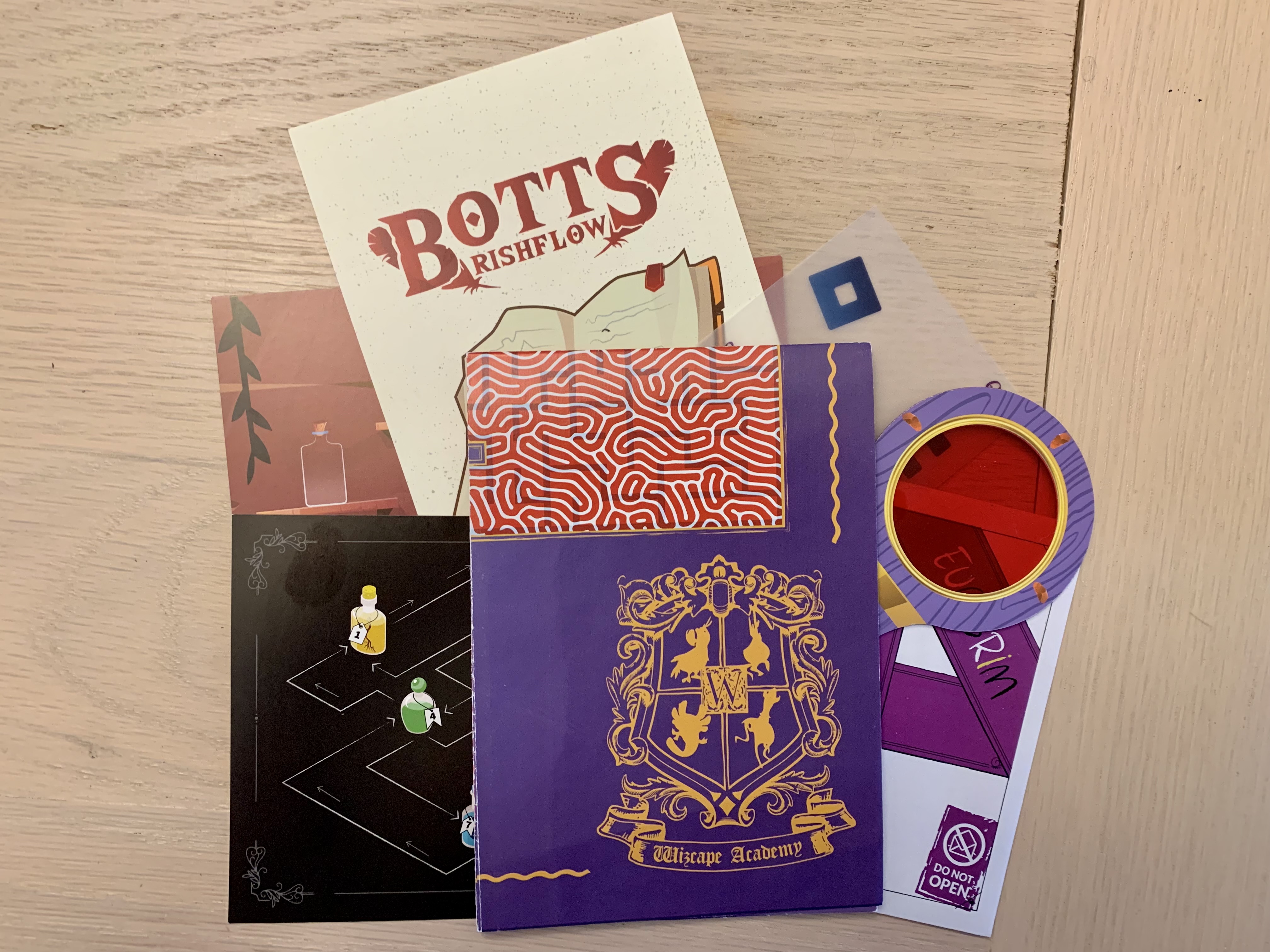 This game will have players working with a mix of physical and digital components to solve puzzles. The puzzles are all themed around magical activities such as creating spells and potions. Often directions and clues will be given through the digital chat component of the game. Then, players will use the physical components to solve the puzzles, before returning to the online chat to enter their answers.