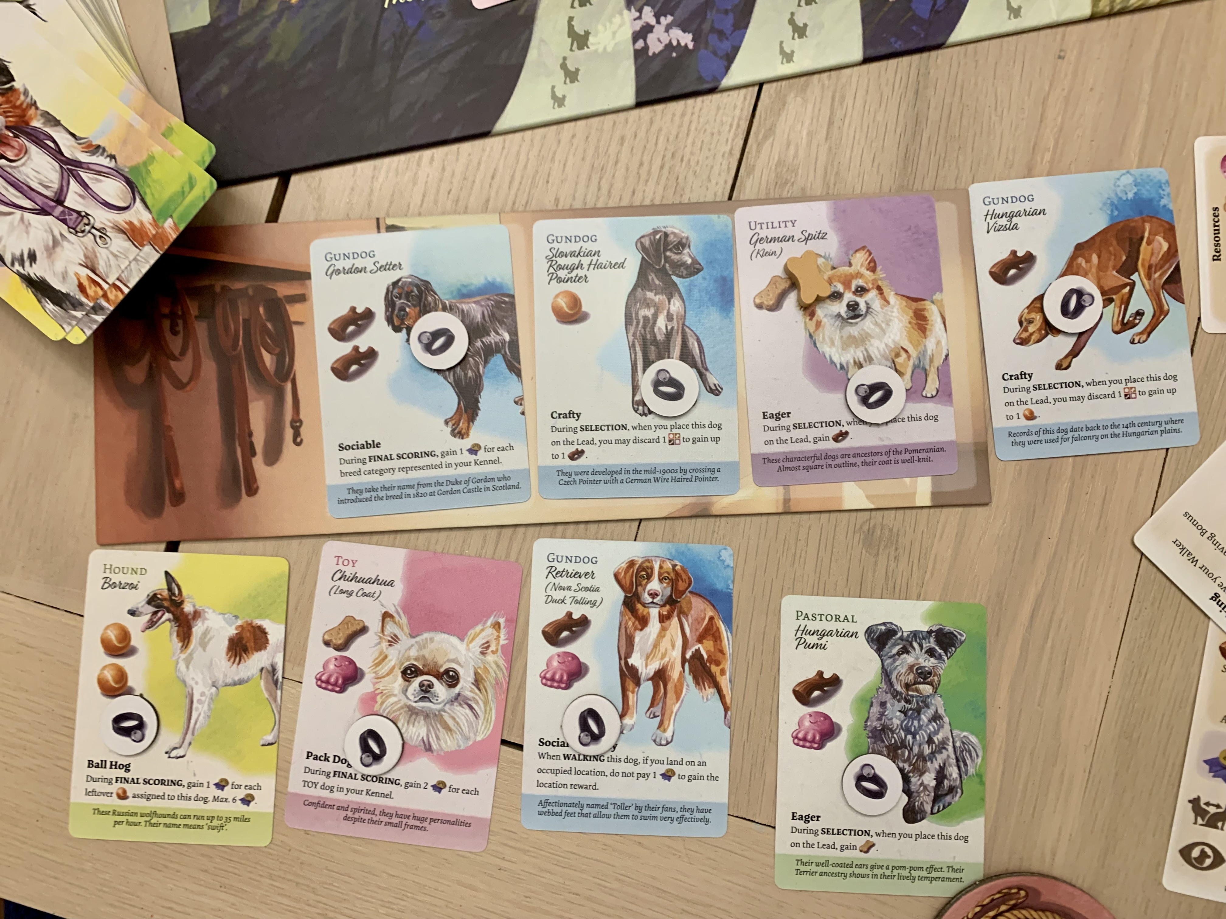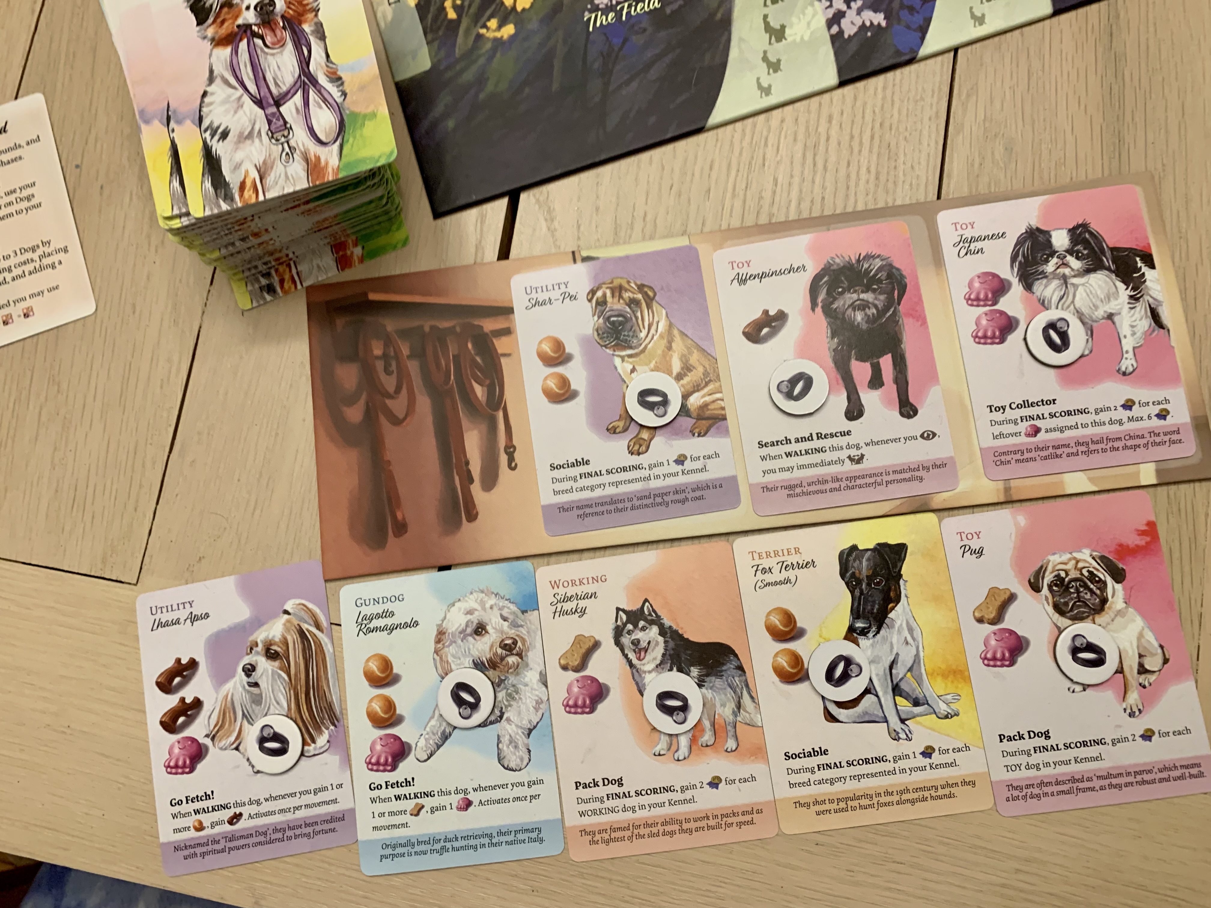 Here players will want to pay close attention to each dog’s special abilities. Some provide end of game scoring points, but many others will prove beneficial during selection or on a walk.