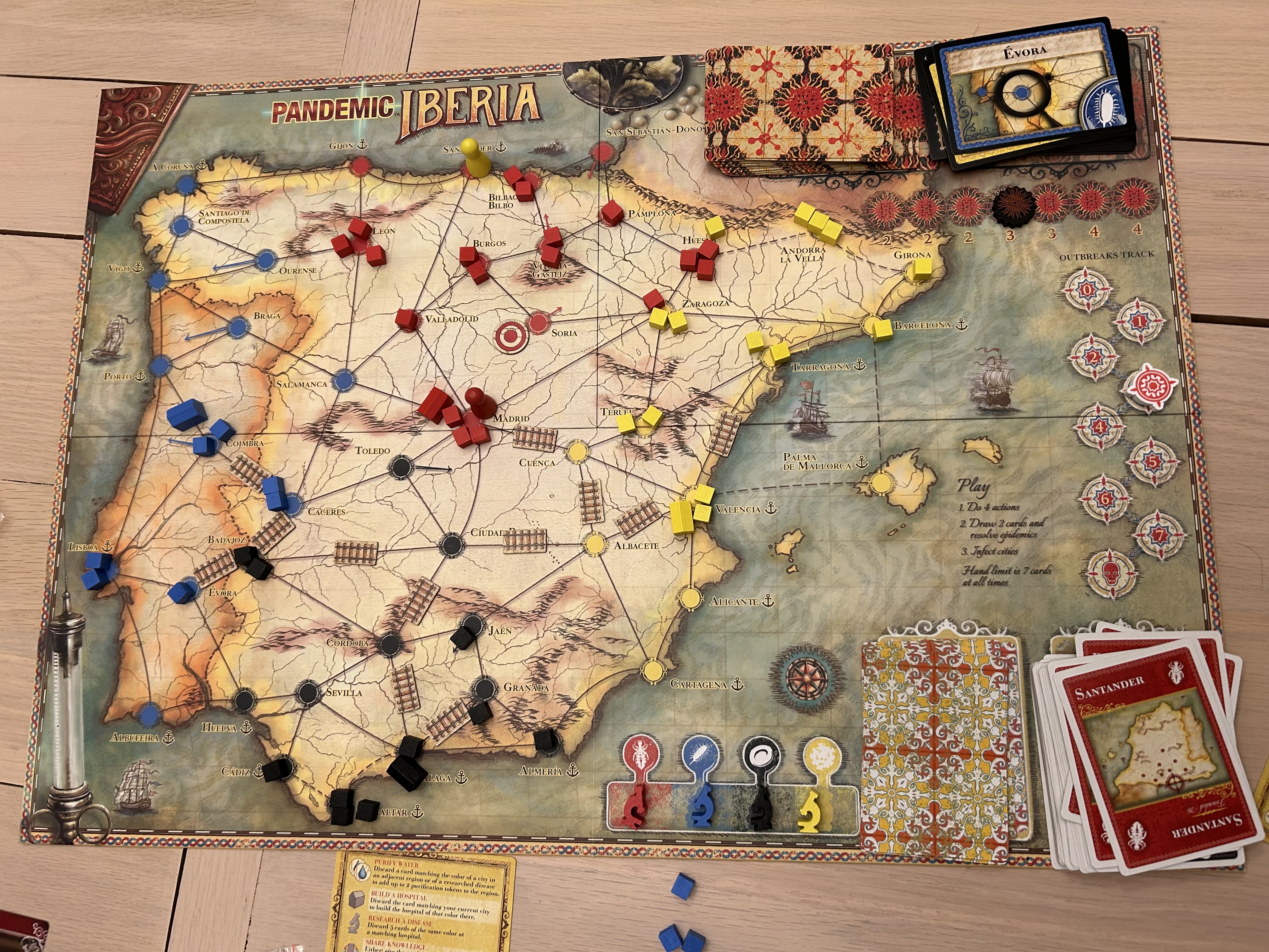 Iberia plays very similarly to the base Pandemic game, but due to the setting taking place in an early age, there are a few differences. Players must rely on building railroads, sailing the seas, and taking care of towns and regions instead of cities. There are also no cures to any of the diseases. Players need to research the four strains, but once they have, it doesn’t make clean up any easier.