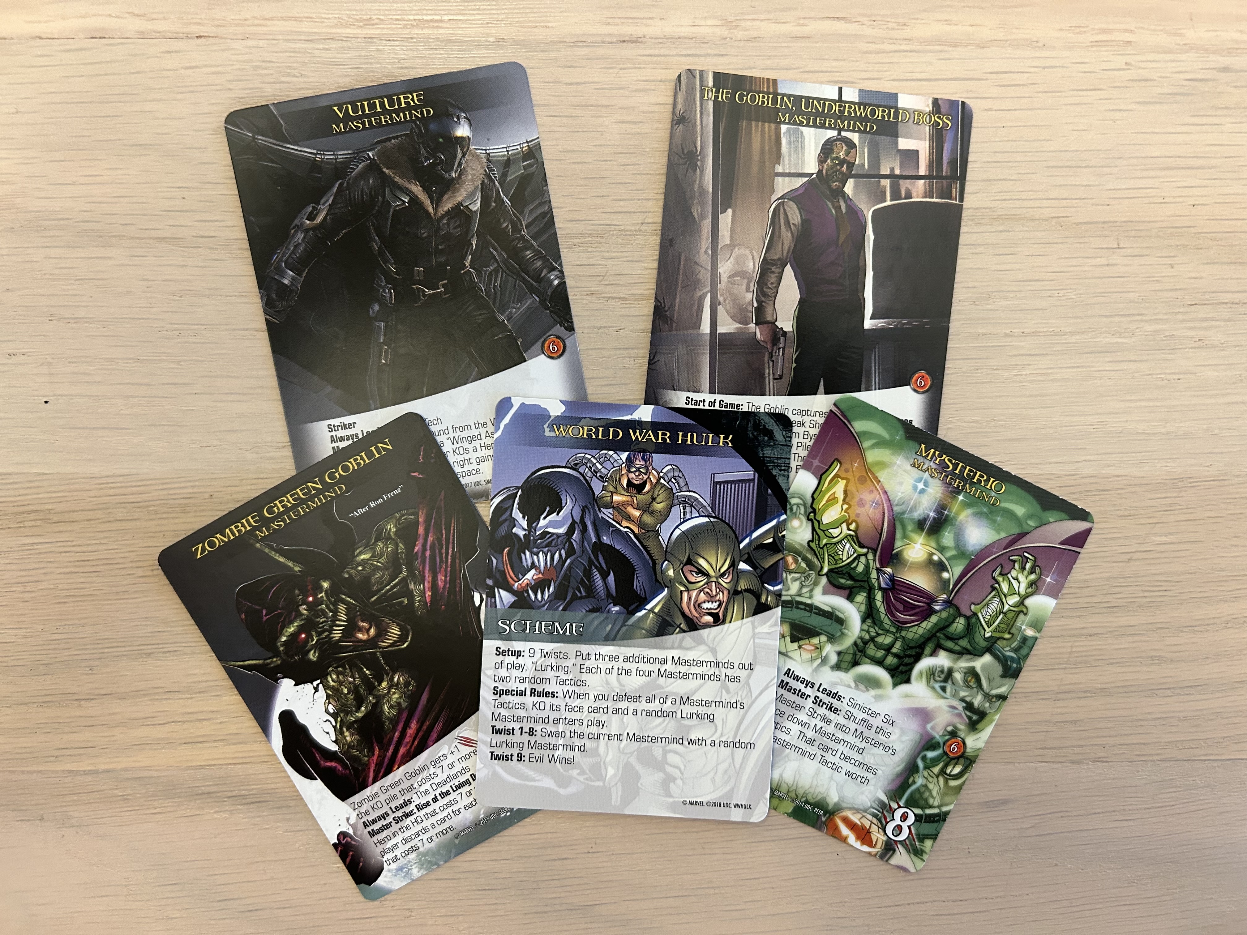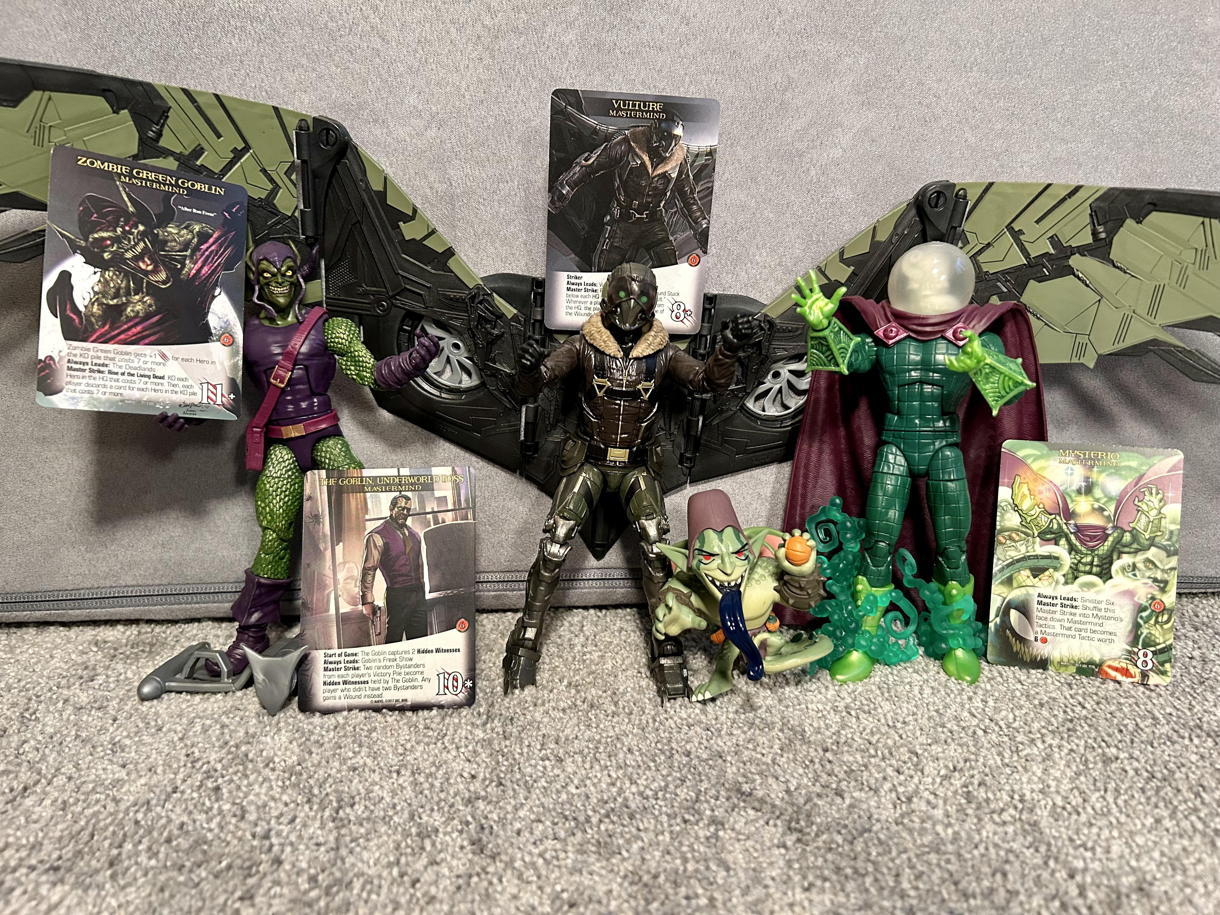Despite Mysterio starting the game, he quickly switched out and then refused to re-enter. First we took down, The Goblin from the Noir universe. Then, the Vulture had his wings clipped. Zombie Green Goblin went next, and then Mysterio was finally forced into play. By that point, we had no problem keeping the city clear and playing massive turns. In fact, some of our turns were accumulating over twenty attack. Mysterio refused to go down without a fight though. His tactics replaced themselves and his Master strikes simply added more tactics.