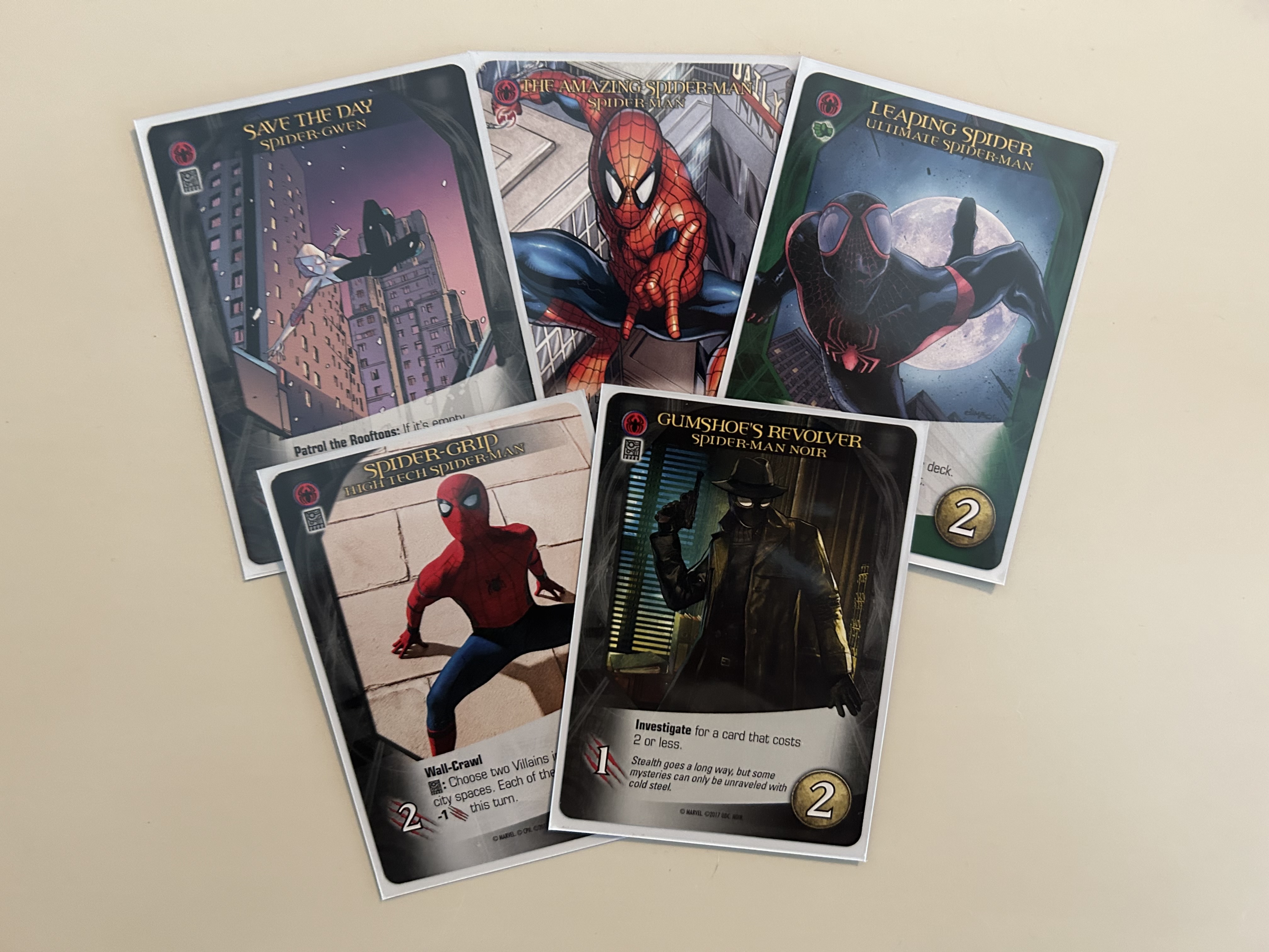 Again, I couldn’t quite make a movie adaptation work out smoothly enough with so many of the big players missing: Spot, Spider-Man 2099, etc. So, I instead grabbed a handful of Spider-Men from across different universes. Miles (Ultimate Spider-Man) and Gwen were musts as was a more traditional Spider-Man. Noir joined due to being in the first movie and then I grabbed Homecoming Spider-man because a live action variant seemed too hard to resist. Also, I don’t play the MCU Legendary products normally, so this felt like a good excuse.
