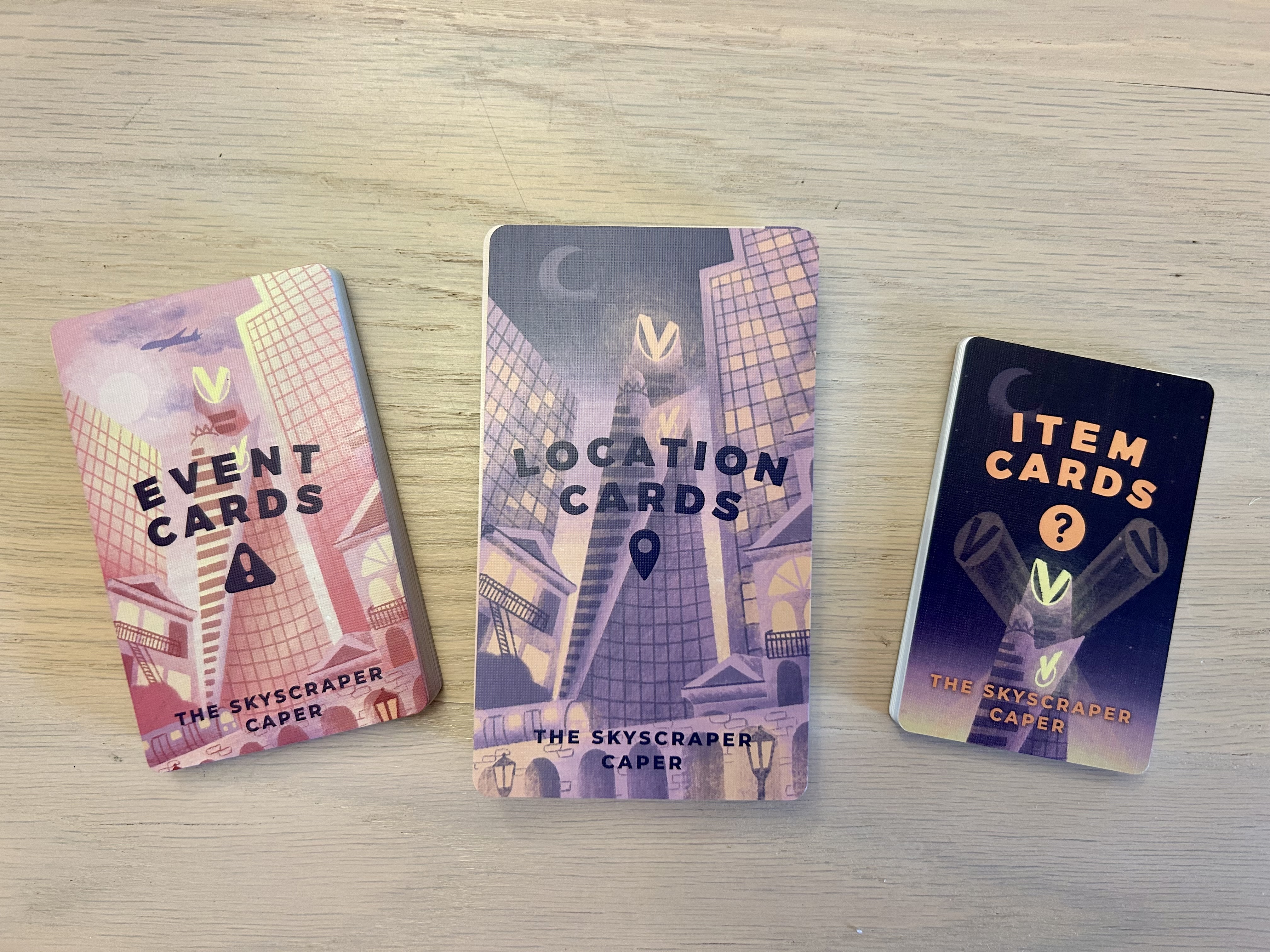 Each game will present a scenario and three decks: Location, Event, and Item. Players will flip over locations cards which may present them with choices or events. Both will affect where the story goes next. Choices will often lead to a new location card. Events will present a challenge for players to overcome. Successes and failures may change the direction of the story, and players may also be able to earn items to use later in their adventure.