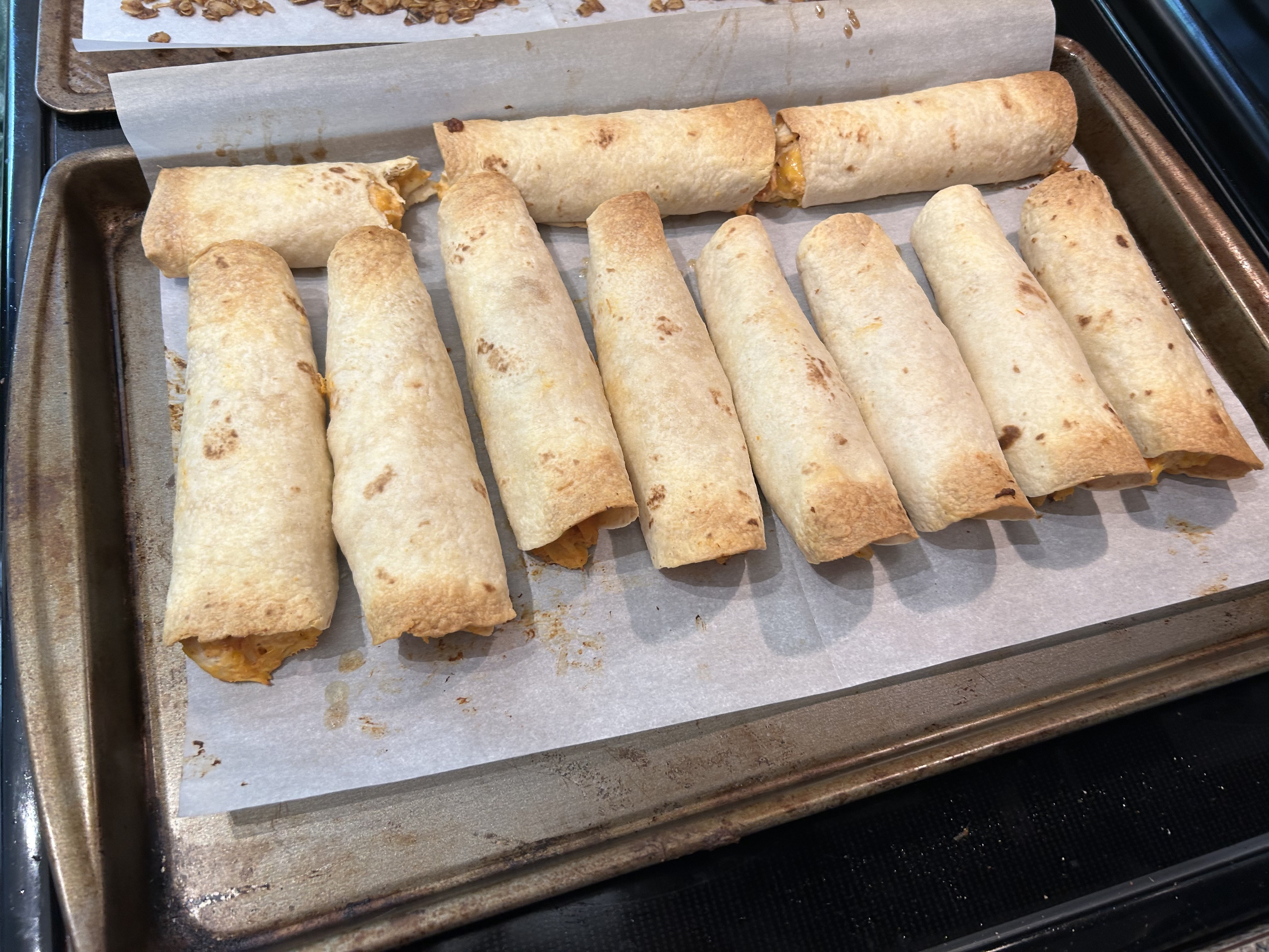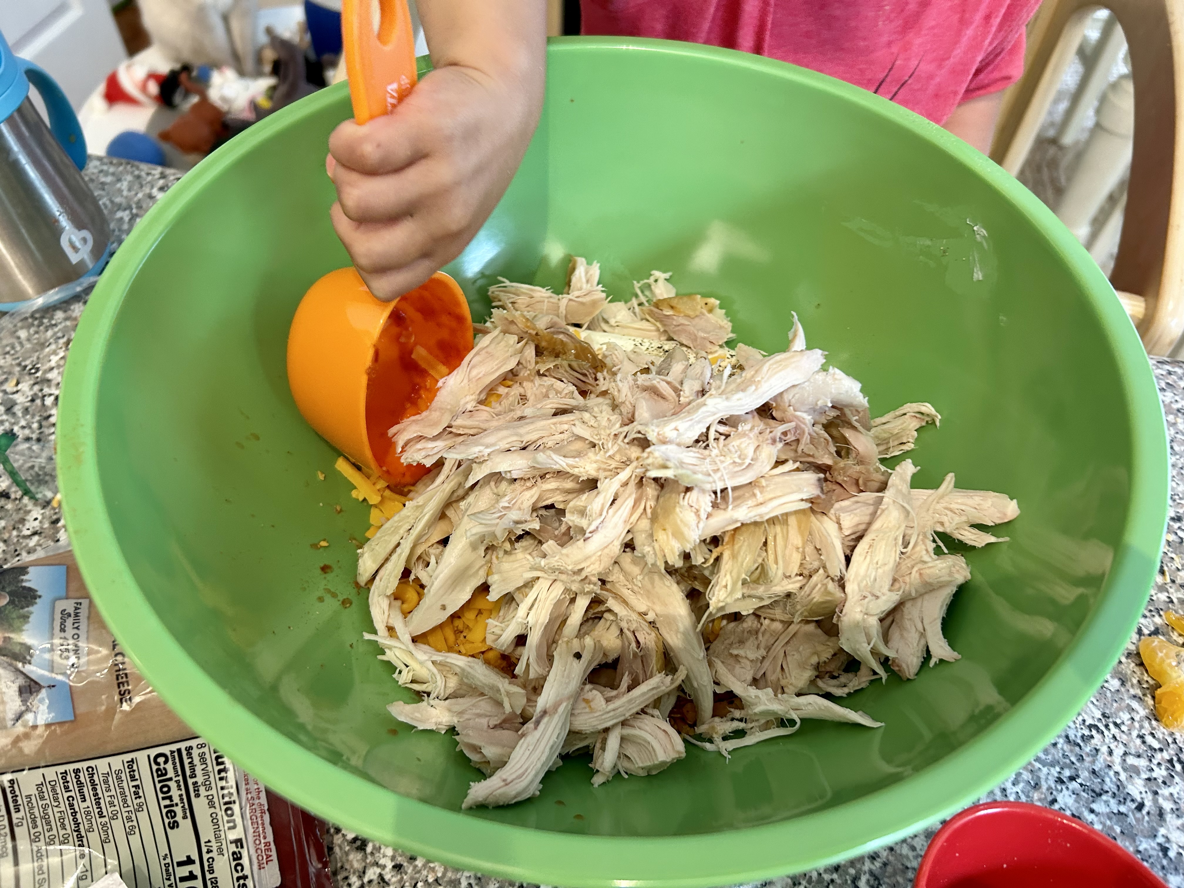 After everything was properly combined, we set them to bake and got to work on the roll-ups/flautas. Once again, we got to combining and mixing ingredients. This time around though, Yeti recognized plenty of ingredients he knew he liked, and wanted to eat cheese and cream cheese as we added it. Everything getting mixed together, caused Yeti to try some foods he doesn’t normally eat, like salsa. Oddly enough, he ended up asking for more salsa and more chicken. He may have been “spoiling” his appetite, but we were just happy to see him eating and trying things.