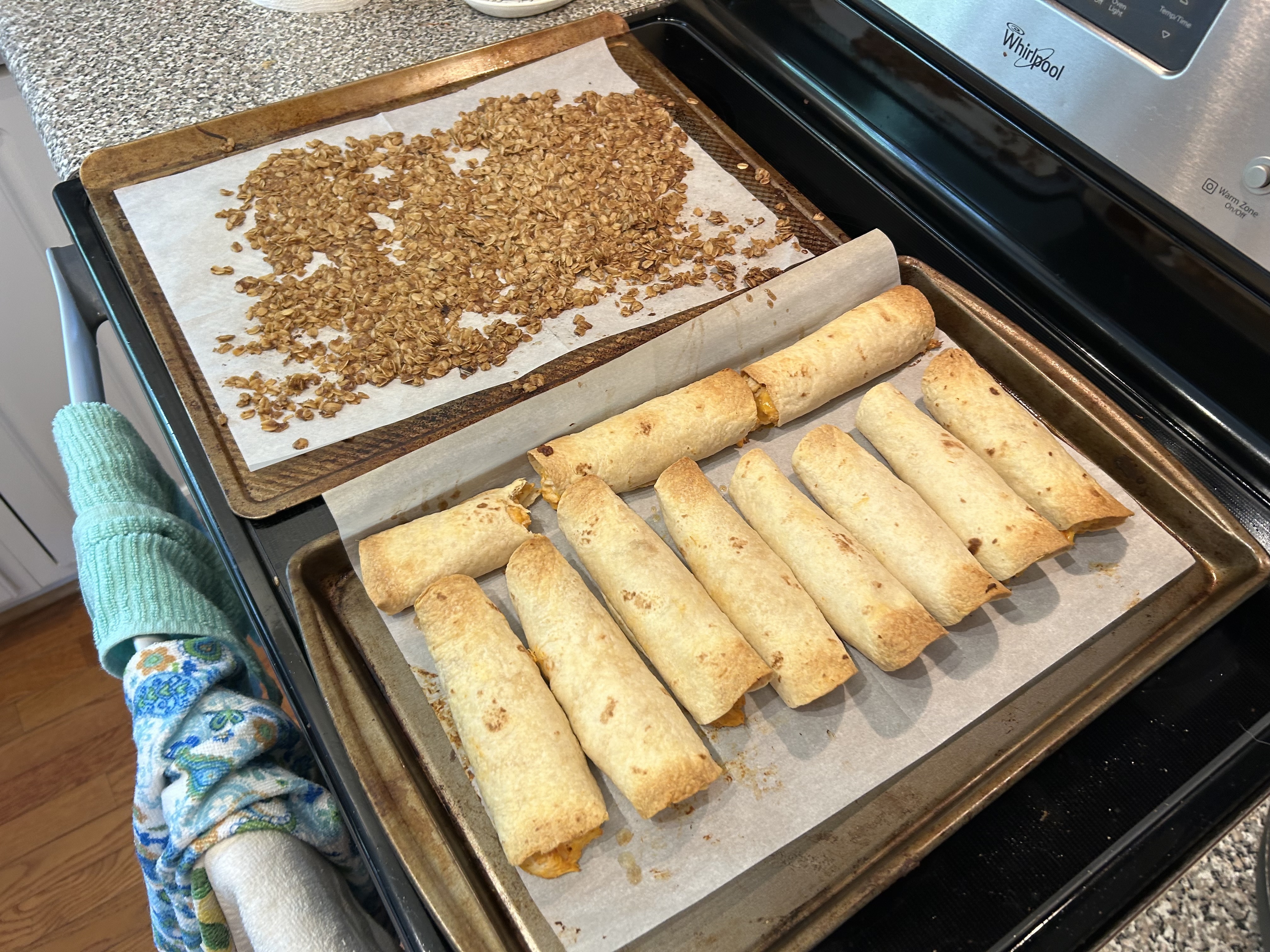 Both recipes were very approachable with a toddler and I liked how they turned out. The granola made a nice snack even without the yogurt and berries, but they also all came together well. I could have used more spice with the flautas, but that would have been a sure fire way to turn Yeti off of them, so I was willing to sacrifice for his sake. The flautas did taste good though, which is good because the recipe yielded so many, we had them for two nights. Both recipes get a thumbs up from me.