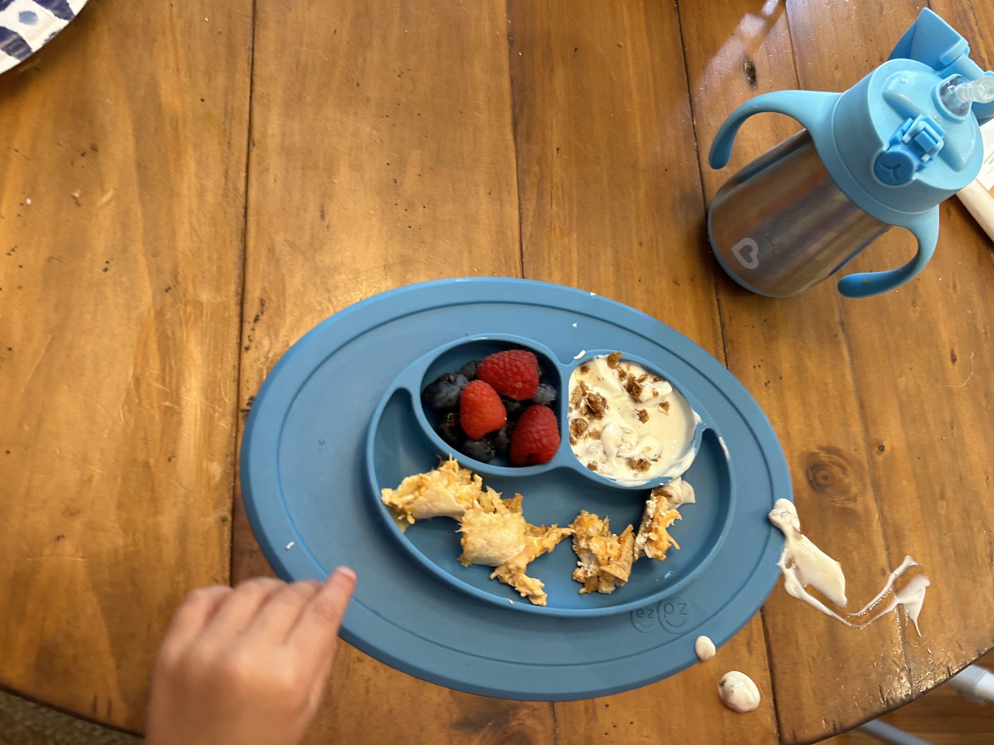 Once dinner was finally done and plated, Yeti reverted to his toddler ways and played the role of picky eater again. After a little coaxing, he ate and really enjoyed his flauta. The granola/yogurt combo was tried, but mostly sat untouched.
