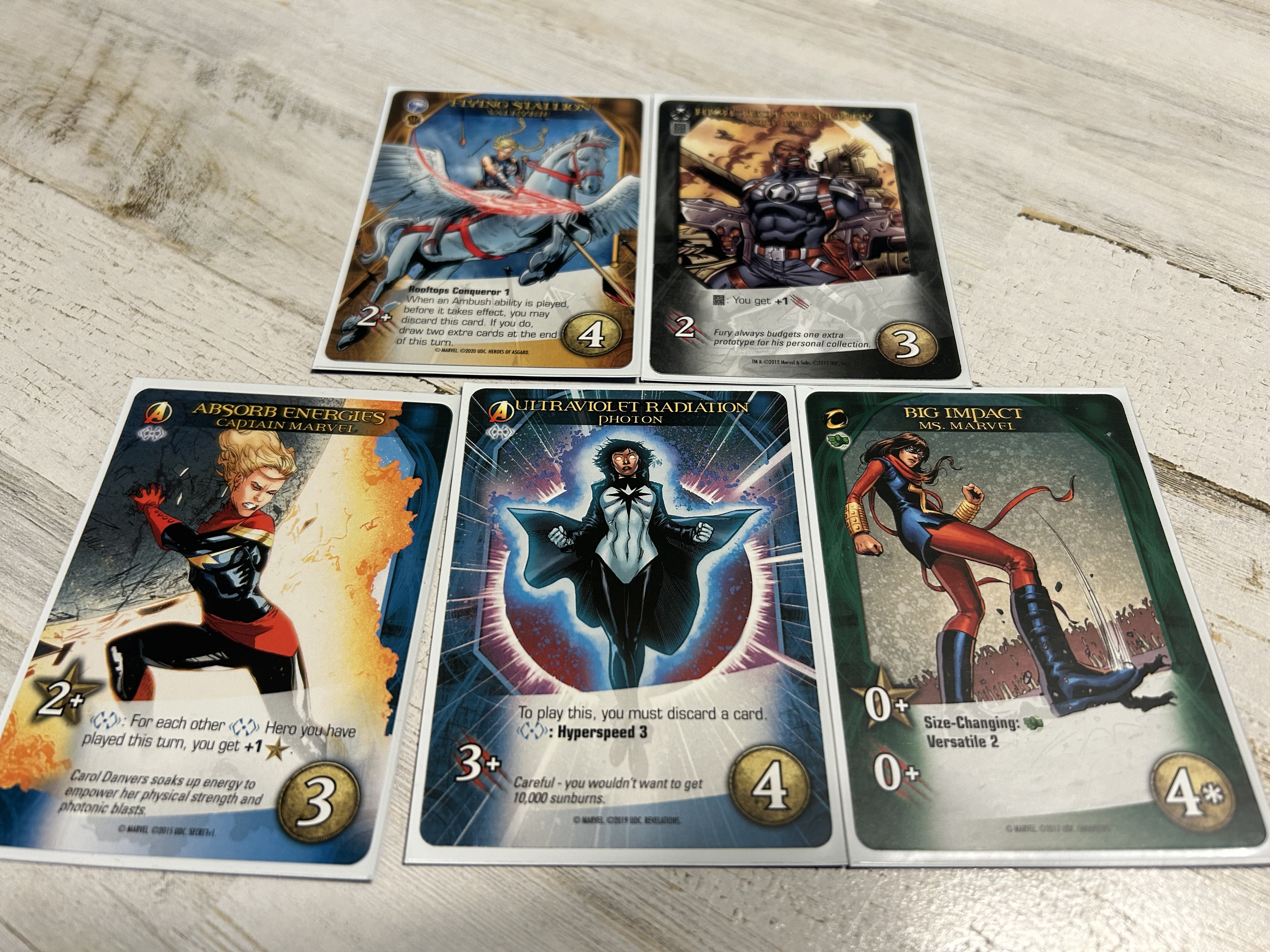 Hero selection offered the easiest and most obvious starting point for this set up. Immediately I could add the three main heroes: Captain Marvel, Ms. Marvel, and Photon (even if Monica doesn’t go by that name in the movie). I chose normal Captain Marvel over S.H.I.E.L.D. Agent Captain Marvel due to color scheme, but either (or both) could work. Nick Fury made for another easy choice due to his large presence in the movie. The final slot is the trickiest to fill, and would need to go to someone with a smaller role. In the end, I went with Valkyrie, even though she is around for only one scene. Players could opt for a few other options including: Kate Bishop.