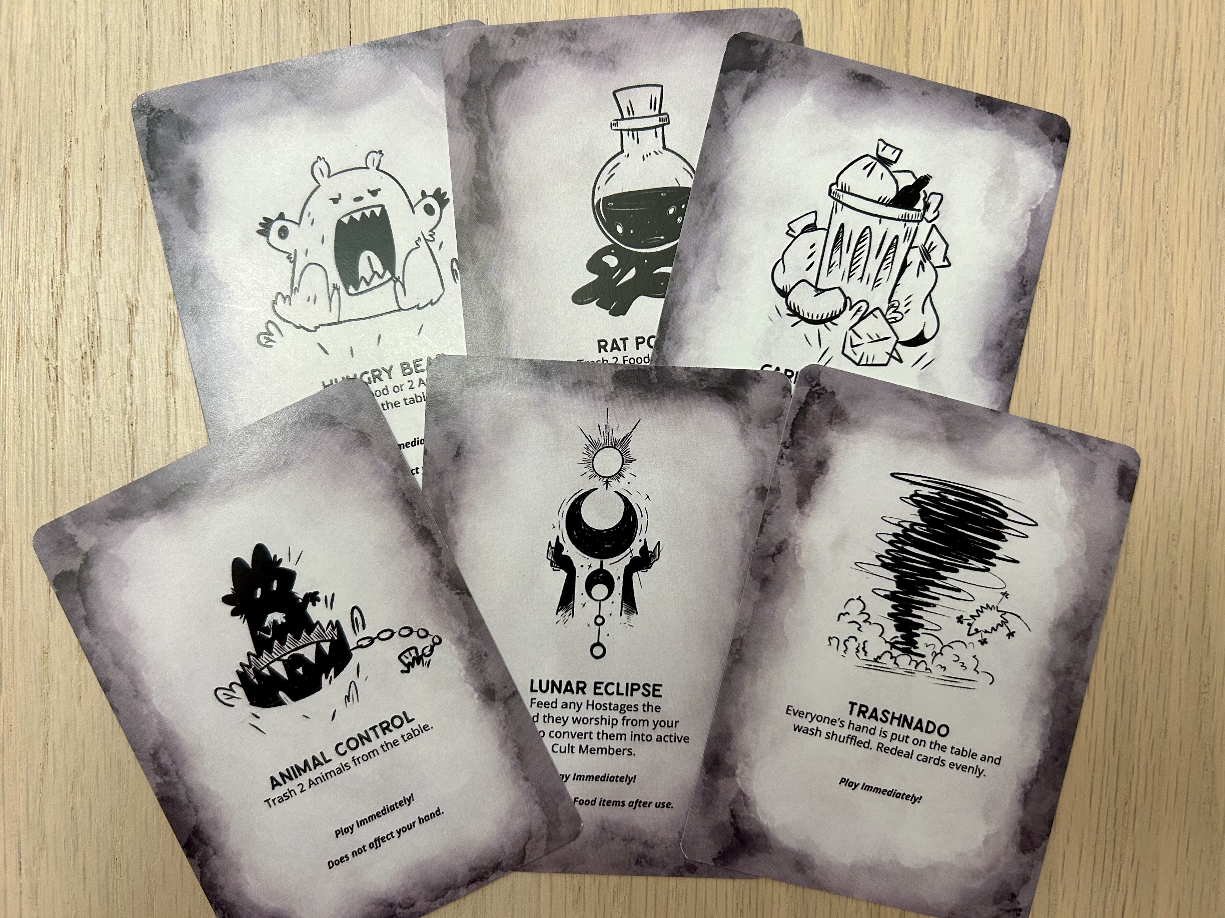 One of the biggest actions is performing a snackrifice. By discarding the right number of food or animals from play will give players a special benefit. However, this also causes a chaos card to be revealed. The chaos card affects all players including the one who made the snackrifice. The card may provide further benefits, hurt cults, or miss them completely.
