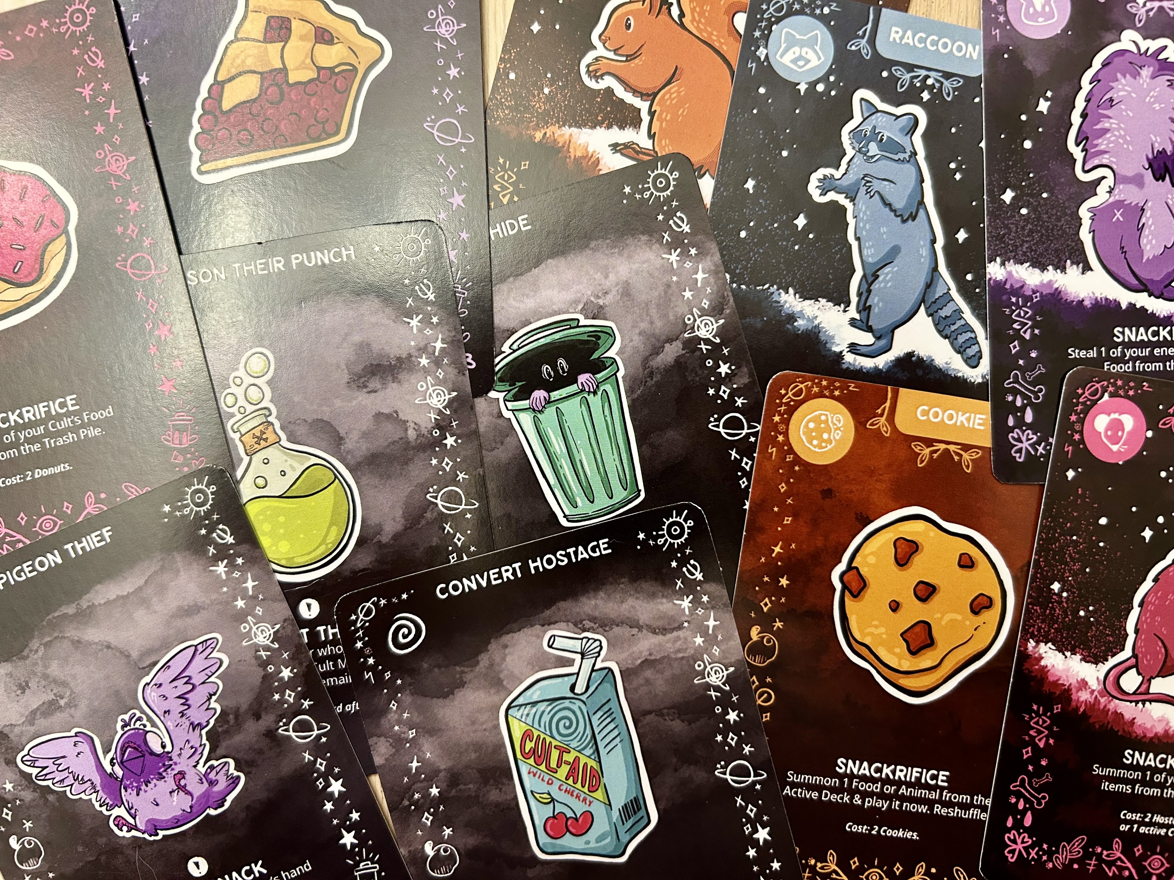 Trash Cult by FoxHen Creatives is a card game which will have everyone competing to help trash animals worship their favorite foods. Players may need to get a little dirty as they not only work to bring down their opponents, but possibly Snackrifice their own cult members along the way. It’s for the greater good, right?