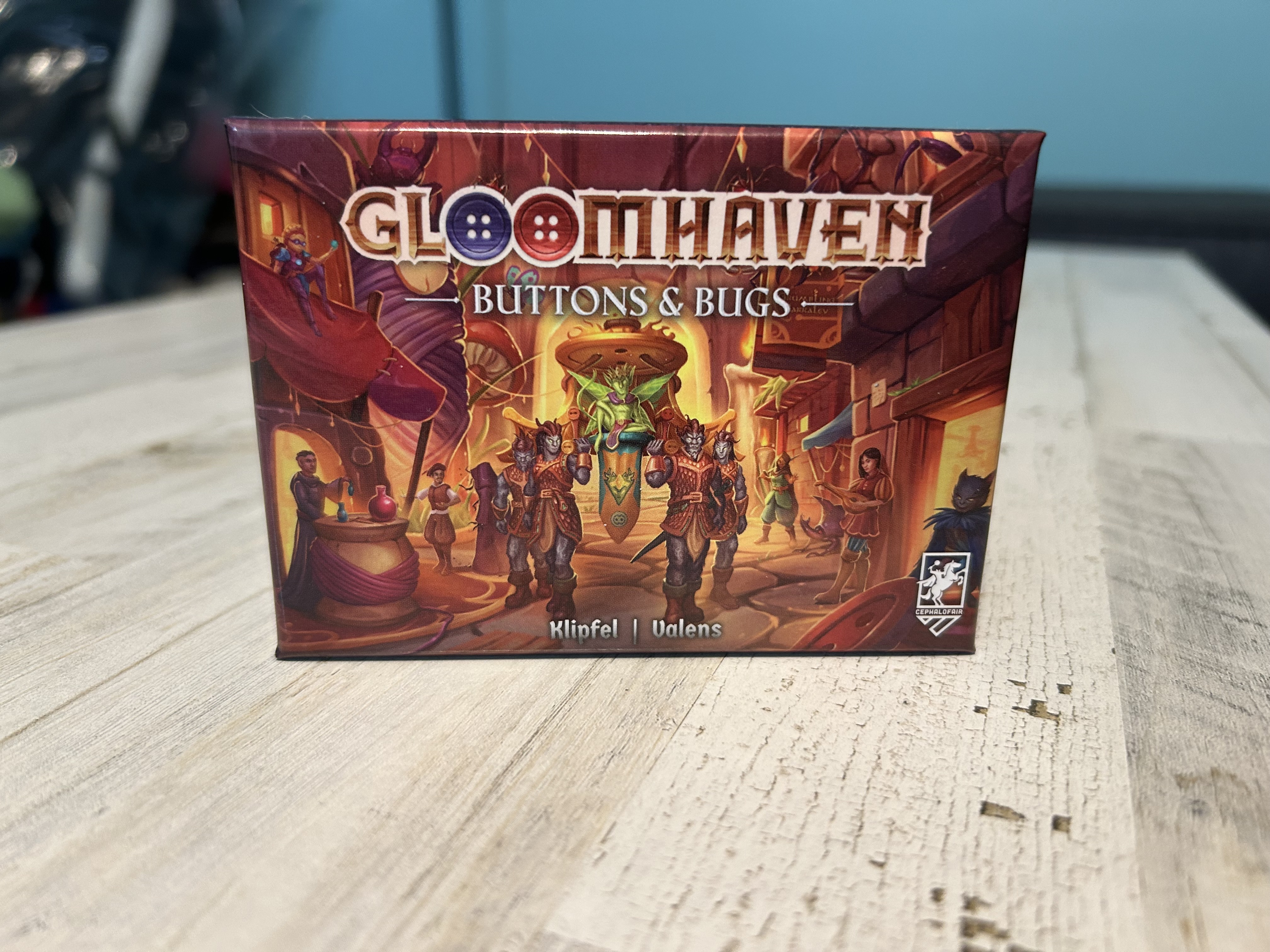 Button and Bugs captures all the dungeon crawling, combat fun of regular Gloomhaven but condenses it into a mini campaign that fits in a small box.  Scenarios (story, directions, set up, and maps) are all presented through a deck of cards, making set up and tear down super quick and easy.  Even player and enemy character cards, attack modifiers, and more are all found on a few cards.