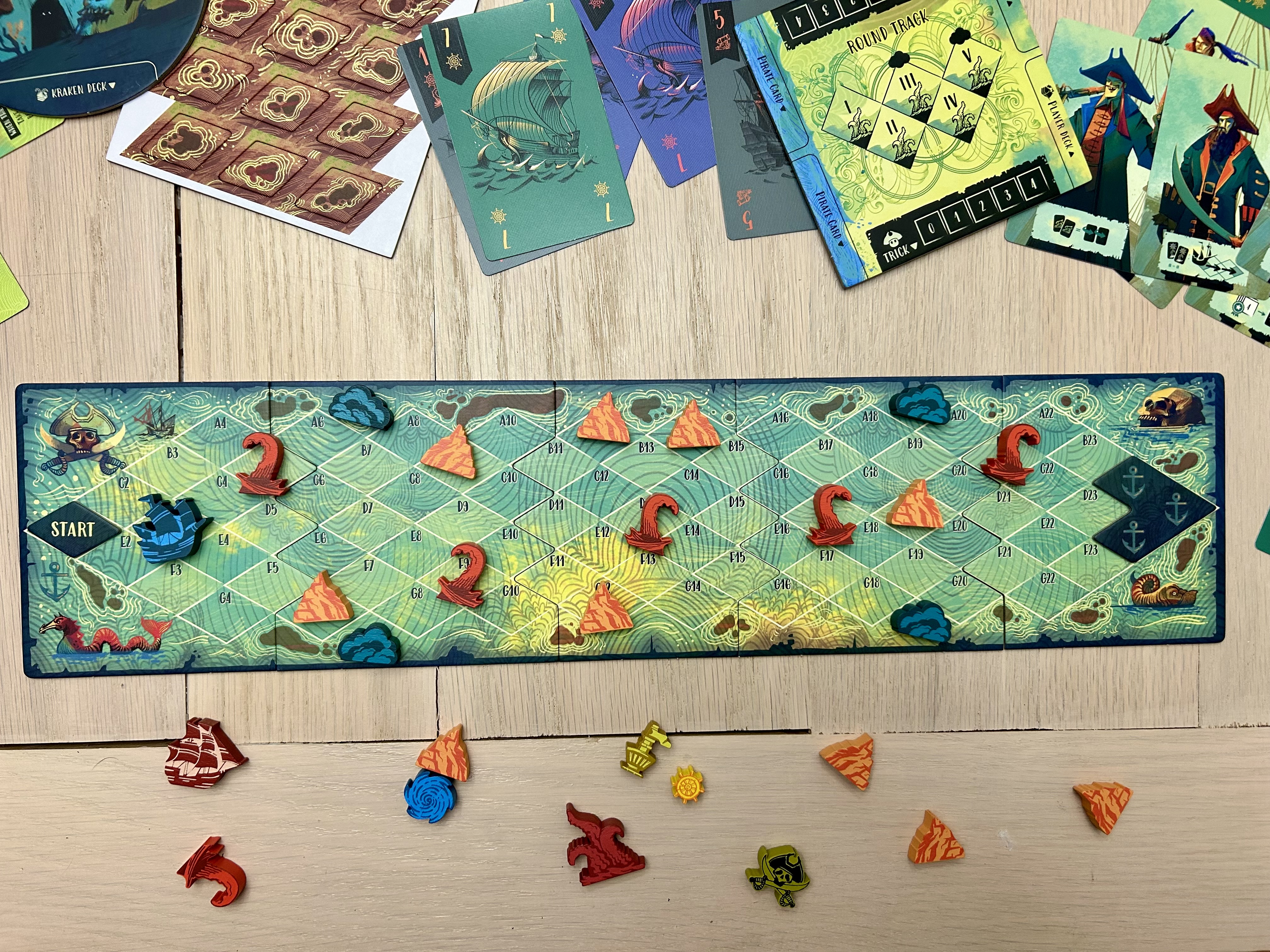 In Sail, players are trying to navigate their pirate ship across the ocean. They must work together to progress, avoid obstacles, and fight sea creatures.  They must also move fast enough to avoid storms and running out of cards.  The twist with Sail is that it’s a two-player trick taking game.  Players move the boat based on who wins which tricks and which cards are played. Along with mechanics that change the draw deck, ones that damage the ship/fight the Kraken, and different player powers, Sail proves to be a good time.