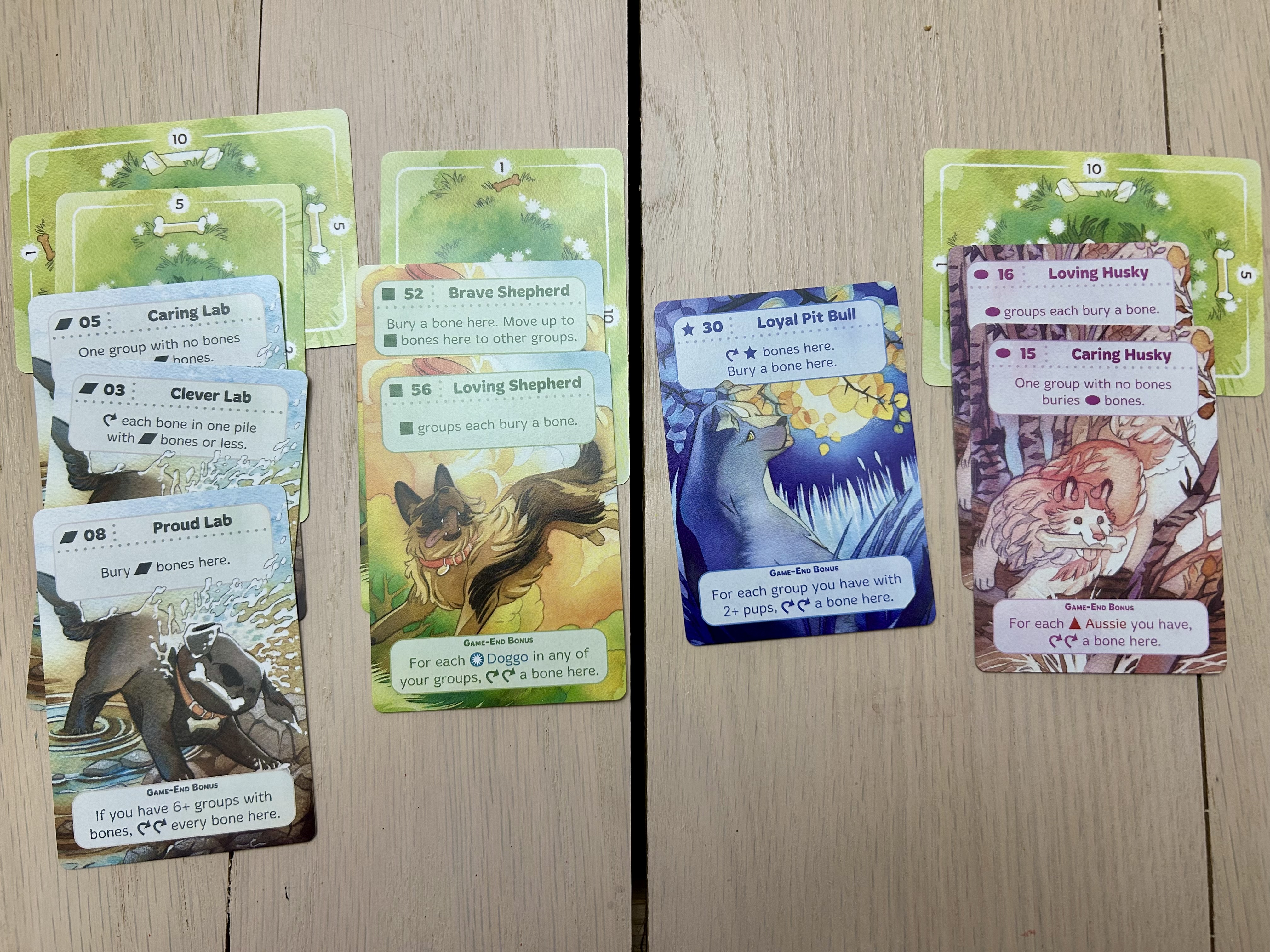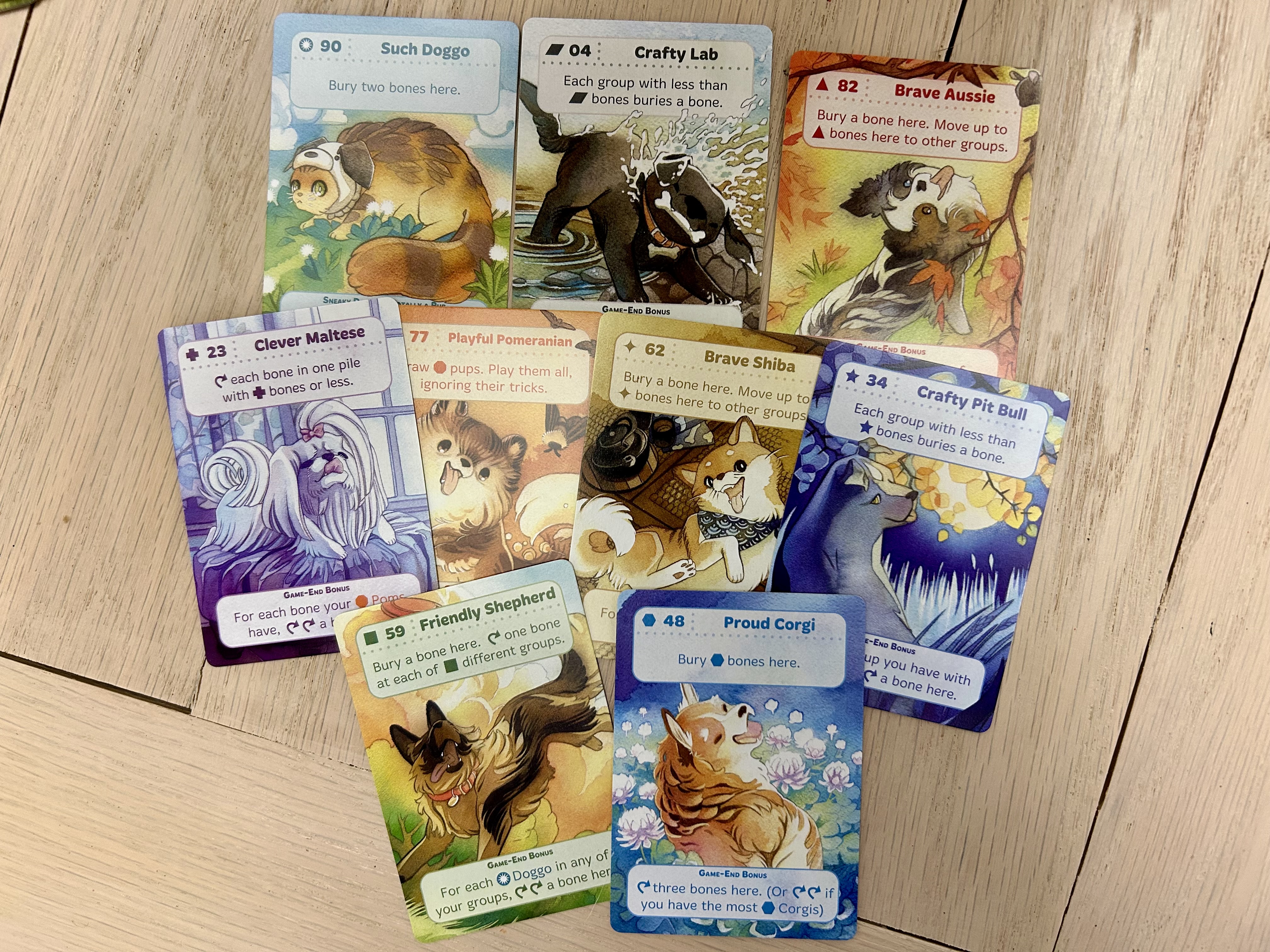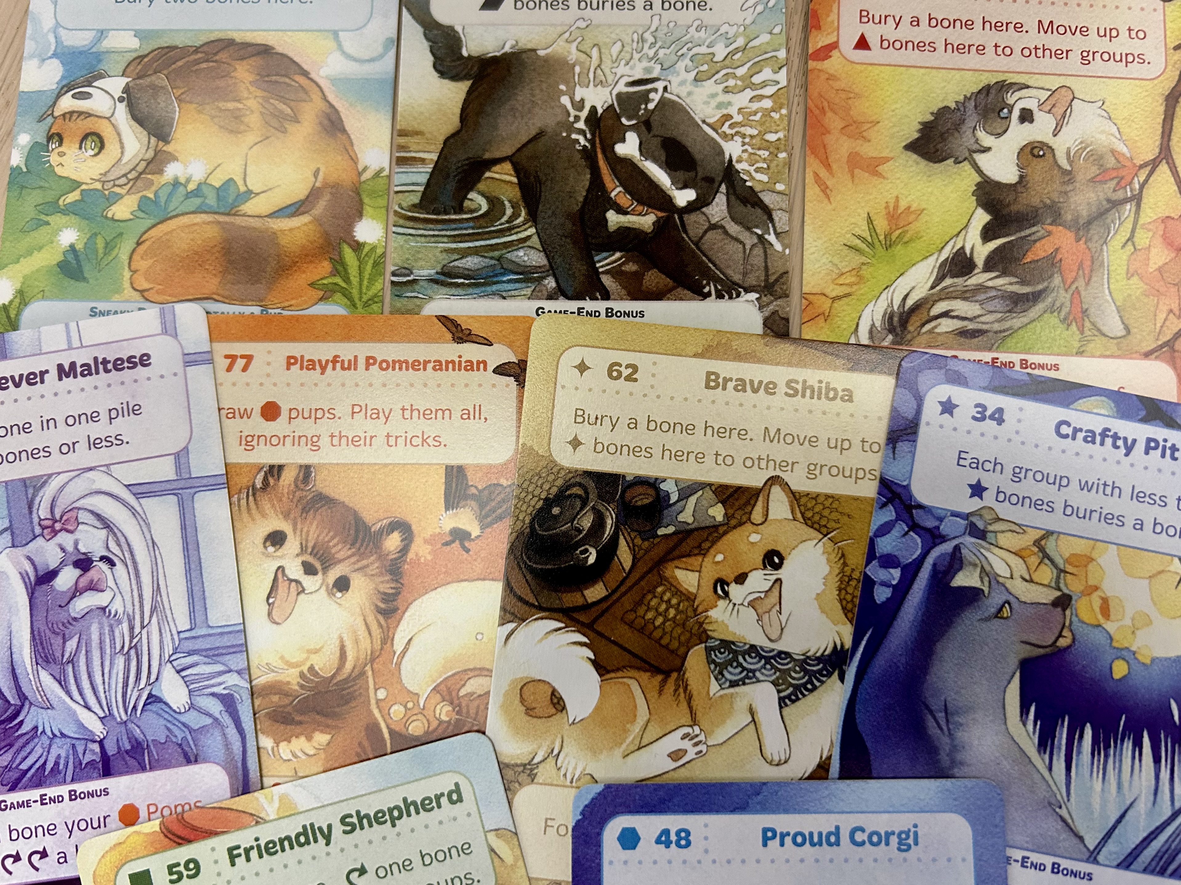 As the game progresses, players’ dog abilities will gain in power as there are more dogs to count in triggers and more bones to interact with on the field. At the end of the game, will trigger their end of game bonuses and count up the score from their bones. The player with the highest bone score wins!