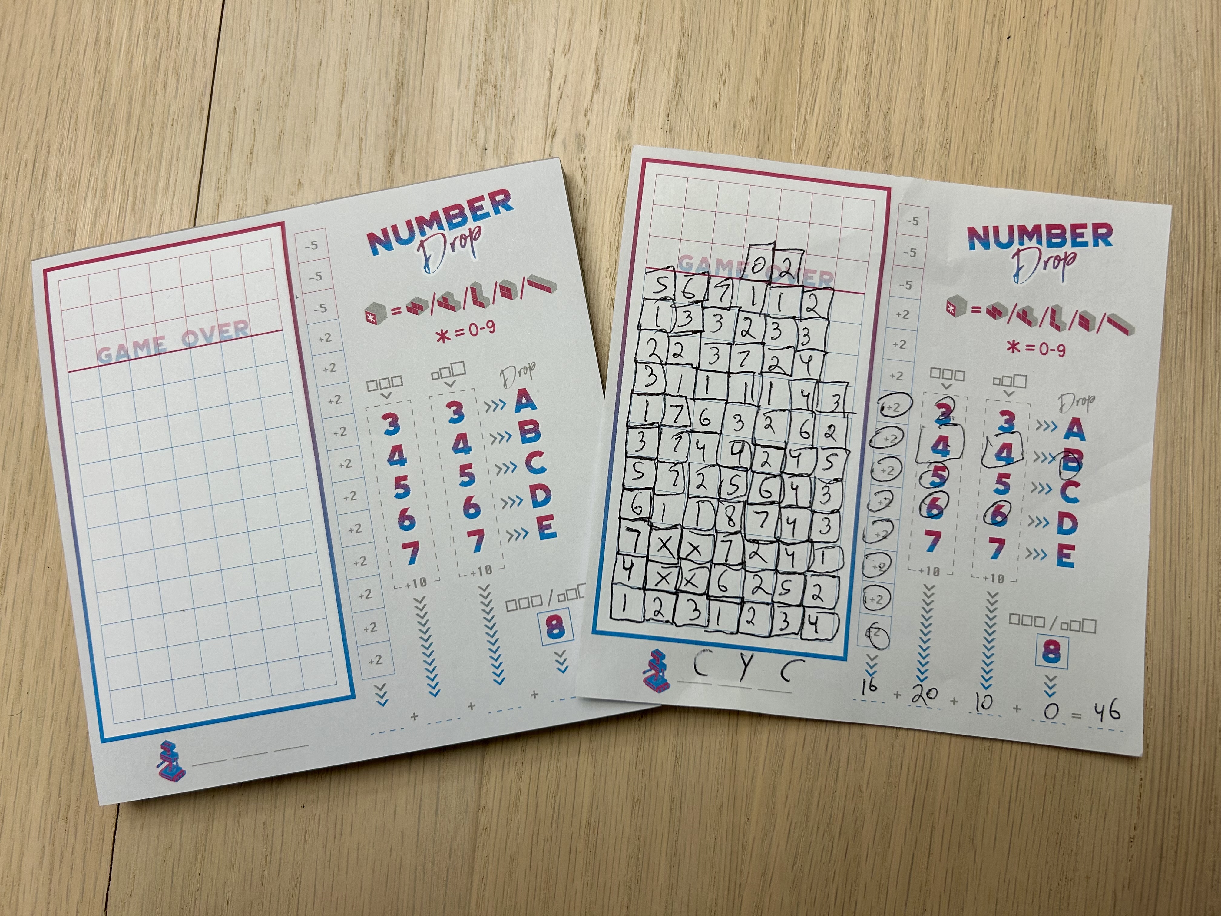 Number Drop is a roll and write experience that evokes classic tetromino gameplay (think Tetris). With the roll of some dice, players will create number-filled shapes that they will drop into a grid system. With some careful thought and planning, players will score combols, rack up points, and maybe even set their own high score!