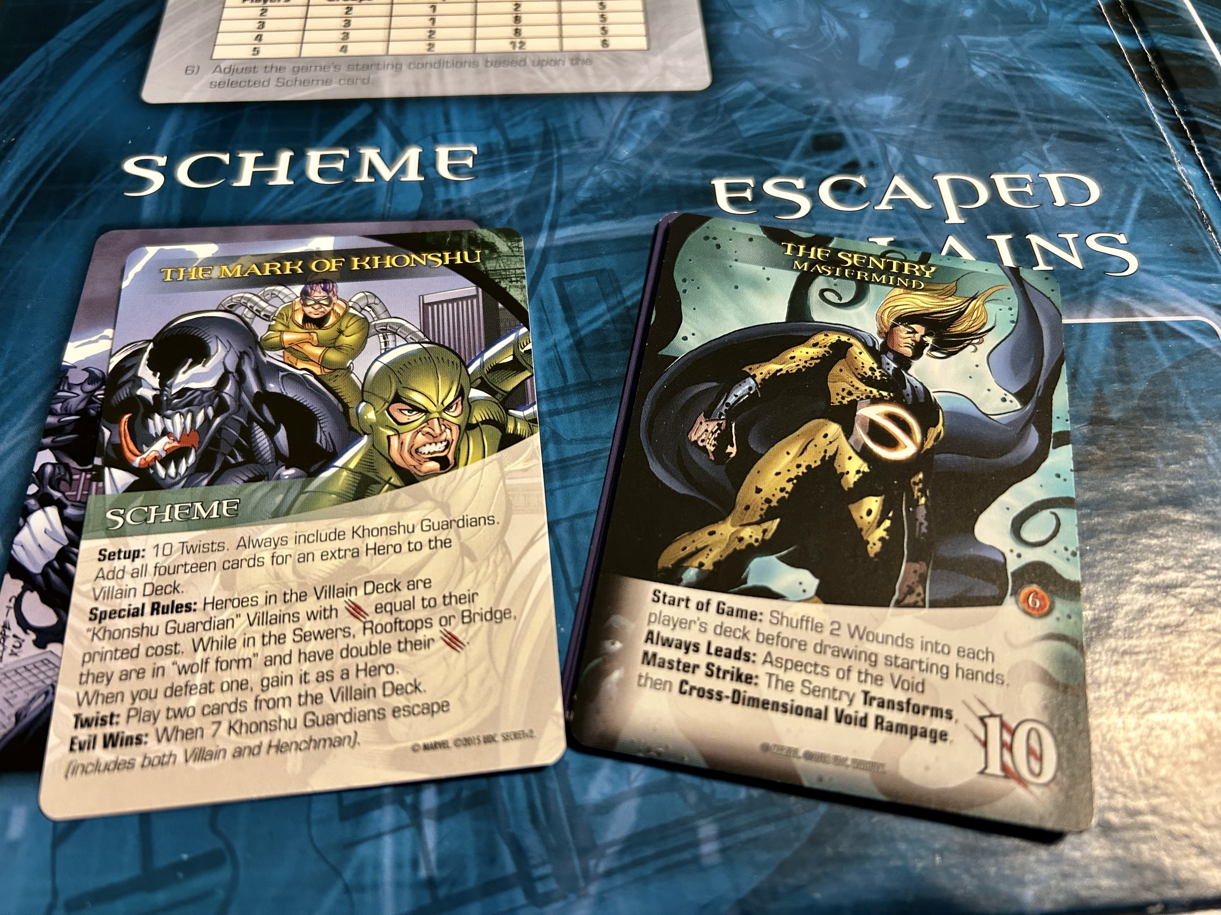 The Sentry as the mastermind just made sense. He/The Void are the “big bad” that the Thunderbolts had to deal with at the end of the movie. The harder part was finding a scheme to represent the nightmare maze they had to battle through as a team. After some thought, I went with “The Mark of Khonshu.” That might be odd at first, but looking beyond the name, the scheme just fits. Putting the Sentry hero cards in the villain deck as someone that needs to be fought but who then can join your fight against himself lines up with the movie pretty well. I also liked that the Sentry cards would gain and love power as they moved through the city. At times the Sentry would feel impossible to beat, however, finding the right way to approach and take him on might lead to victory.