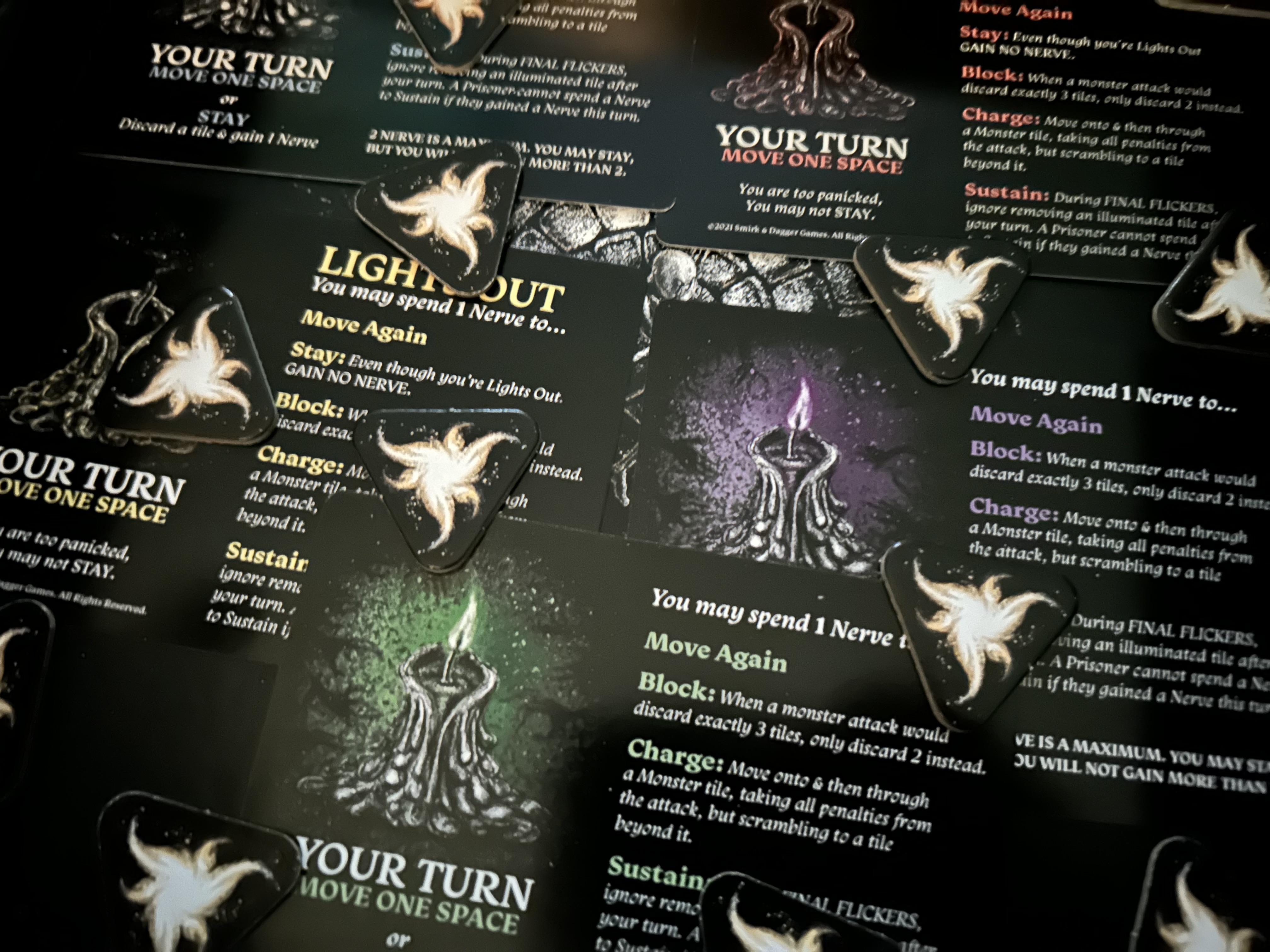 The nerve tokens mentioned earlier, can be used for a few different abilities. Nerve tokens can be used for an extra movement, to discard one fewer tile after a monster attack, to stay in place with an unlit candle, charging into a monster’s space, or holding off tile loss during final flickers.