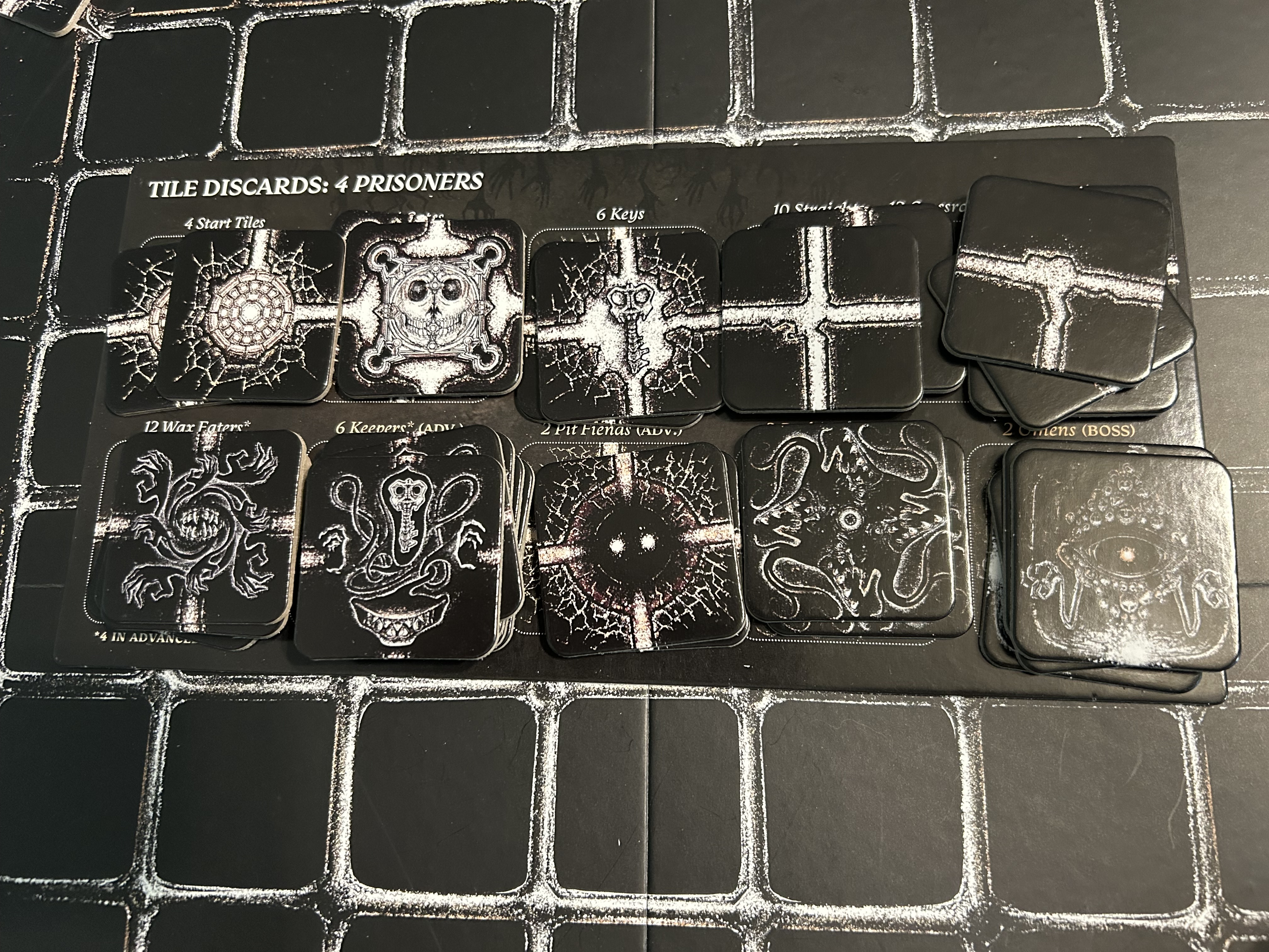 Players begin by taking a player status card, a colored candle/prisoner token, a starting tile, and a nerve token. Then, the board is set out and the tile draw pile is put together. Depending on player count, a different number of tiles will be shuffled and placed on top of the tile deck as their starting tiles. The tiles are housed in the tile holder, which looks like a melting candle.
