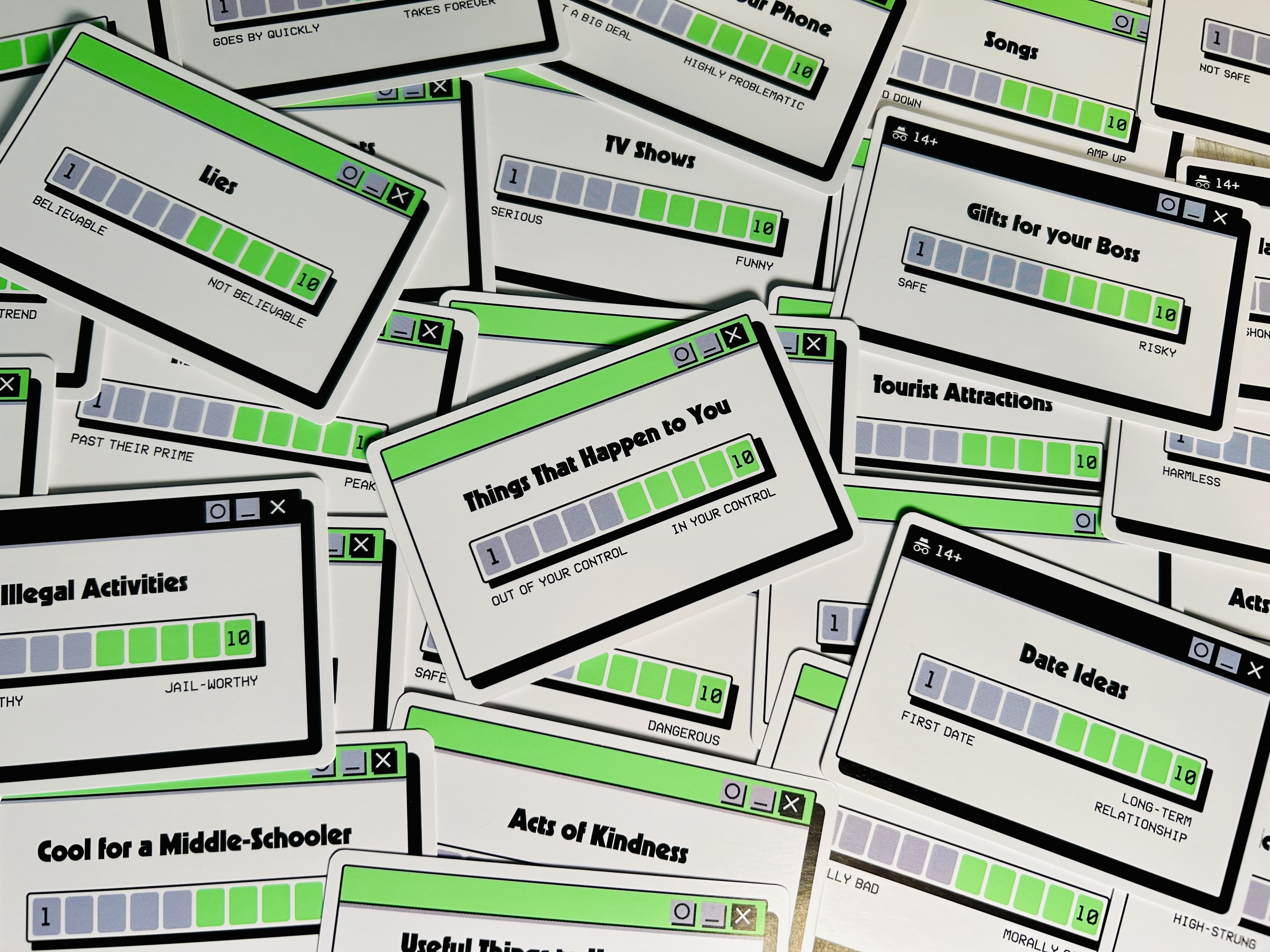 Going clockwise, each player will share their prompt with the guesser (they may choose either side of their card) and answer it. Humans should be trying to give an answer that will make the guesser think of their shutdown code number. Every prompt is a scale, so clue givers will want to give an answer that should help the guesser focus on the right number.