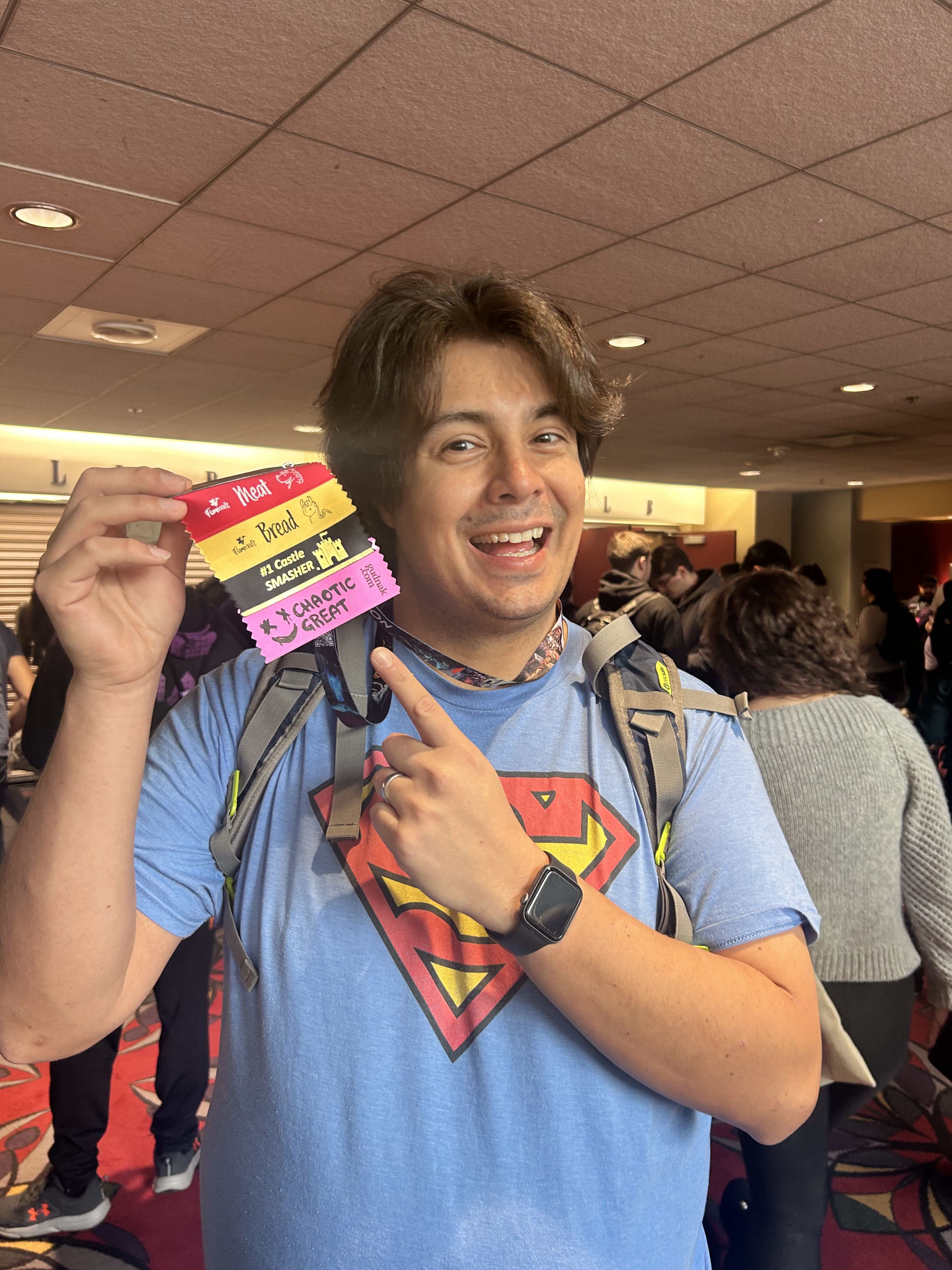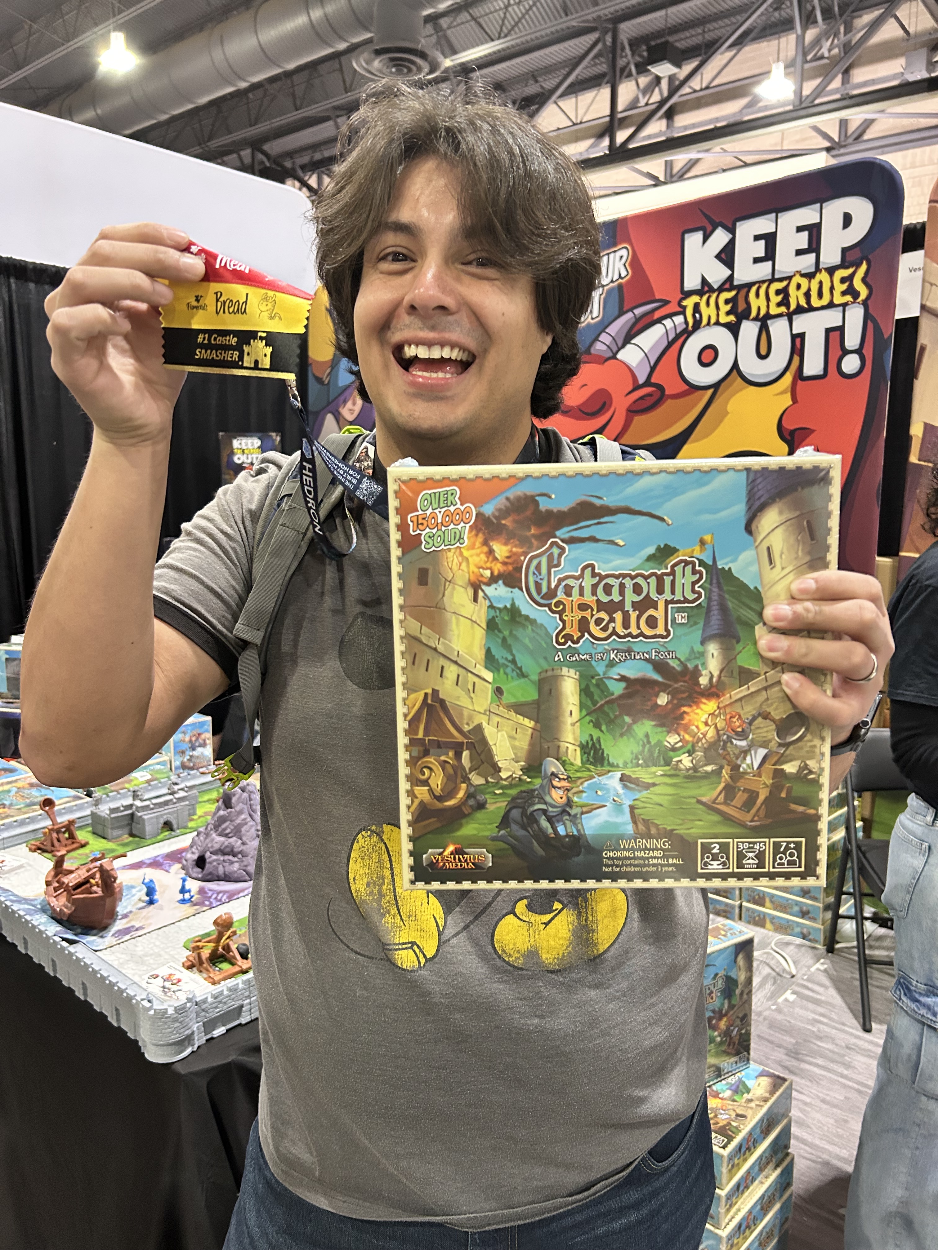 One booth featured the game Catapult Feud, a game where you build castles and then try to knock down your opponent’s castle using an actual mini catapult. Not only did they hold demos, but if you beat another attendee, you won a badge ribbon. I left with my “#1 Castle Smasher” ribbon.